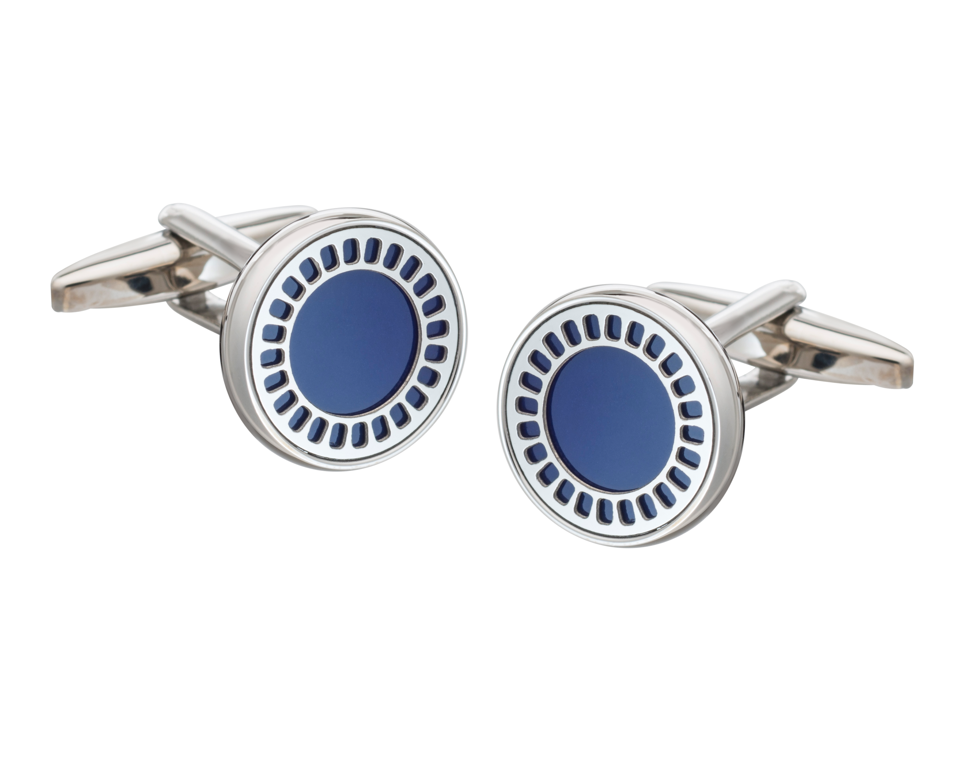 Reminiscent of a vintage film reel the bright and bold centre of these stylish blue cufflinks is made from synthetic lapis. With fine detailing and smooth edging they are ideal for matching with navy blue suiting for a classic look.