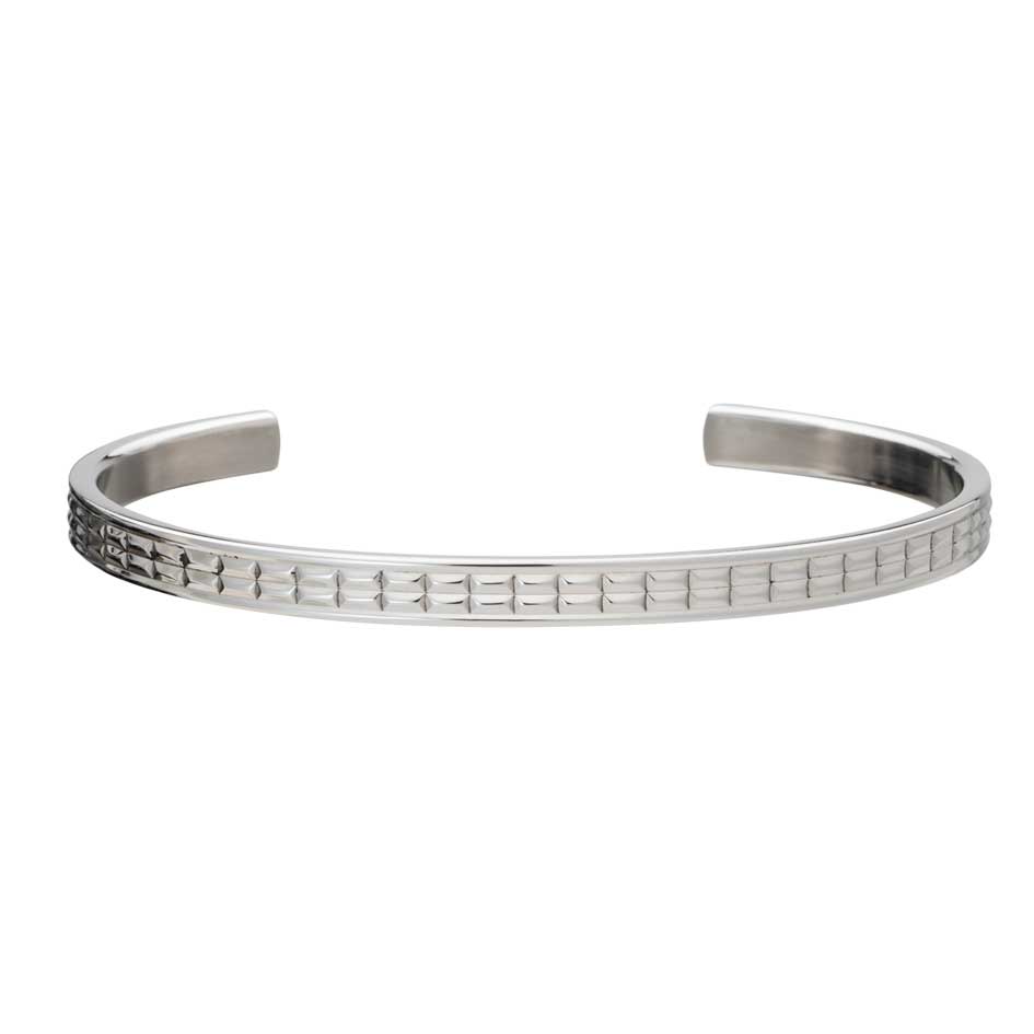Crafted from Stainless Steel and featuring an industrial style grid pattern to the front this contemporary cuff bangle will add a stylish touch to any modern's mans attire.