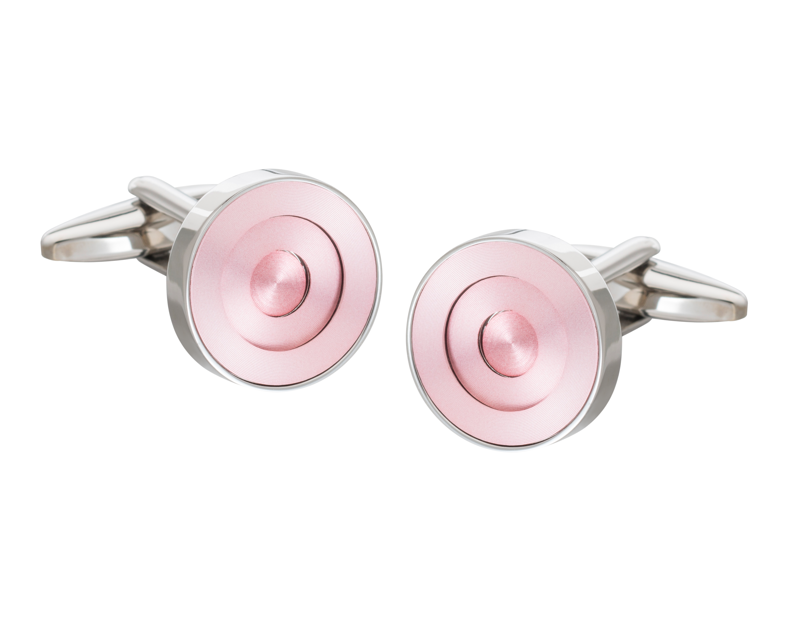 Combining a high-shine casing with three descending layers of delicately textured pink metallic concentric ring inlays, this pair of contemporary cufflinks is a sleek and sophisticated choice. A unique and sharp cufflink it is sure to add a sartorial element to your outfit.