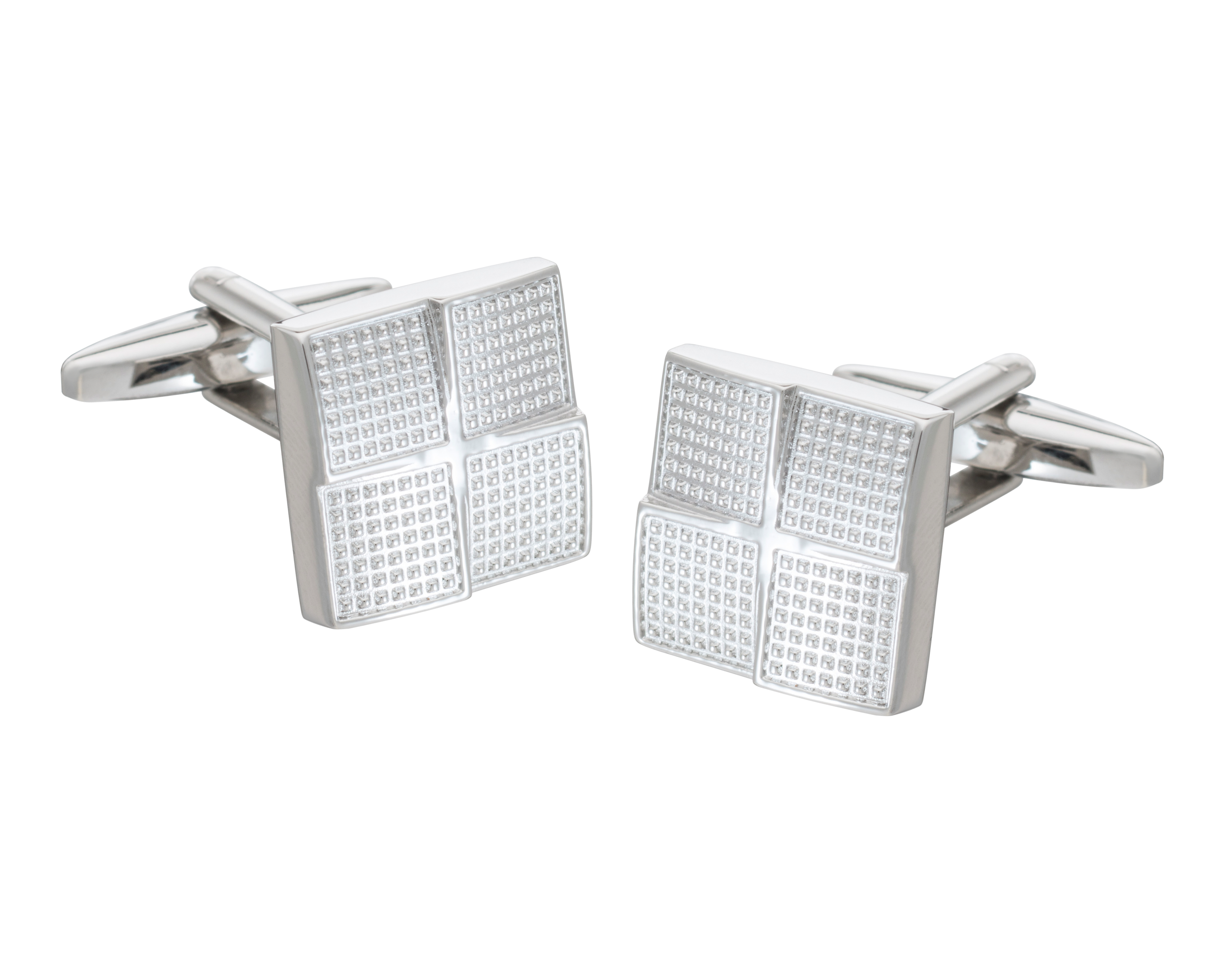 Showcasing four textured quarters of an overall square, each with a differing angular face, this structurally modern cufflink will certainly add interest to your shirt.