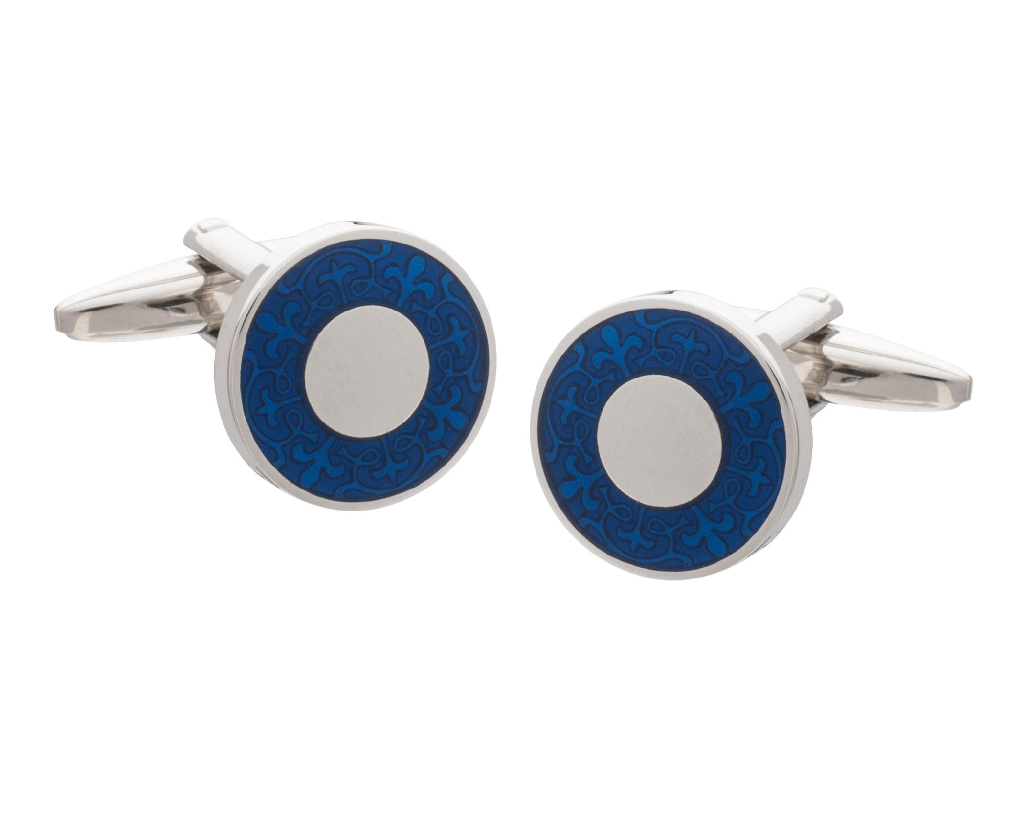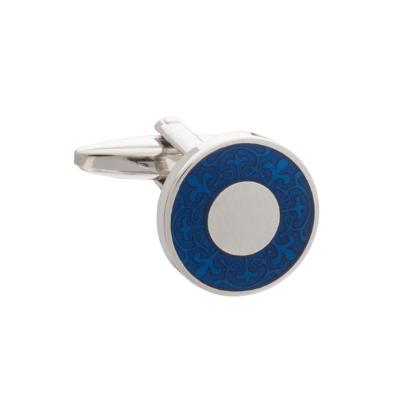 A beautiful fleur de lys pattern is embossed on a blue enamel insert to give these round cufflinks a strong heraldic feel. Striking in colour, they will certainly won’t go unnoticed when worn.