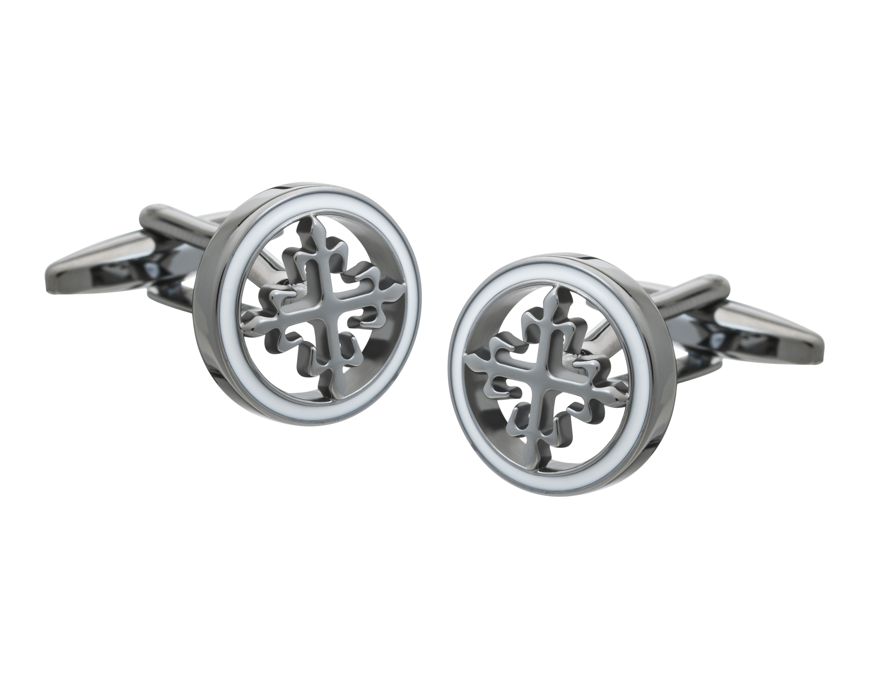 A delicately sculpted vintage cross design is at the centre of these stunning round cufflinks. Neatly framed by a white enamel circle the four cross emblem creates a powerful and masculine cufflink that is both smart and eye catching.