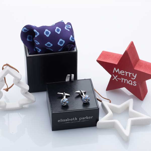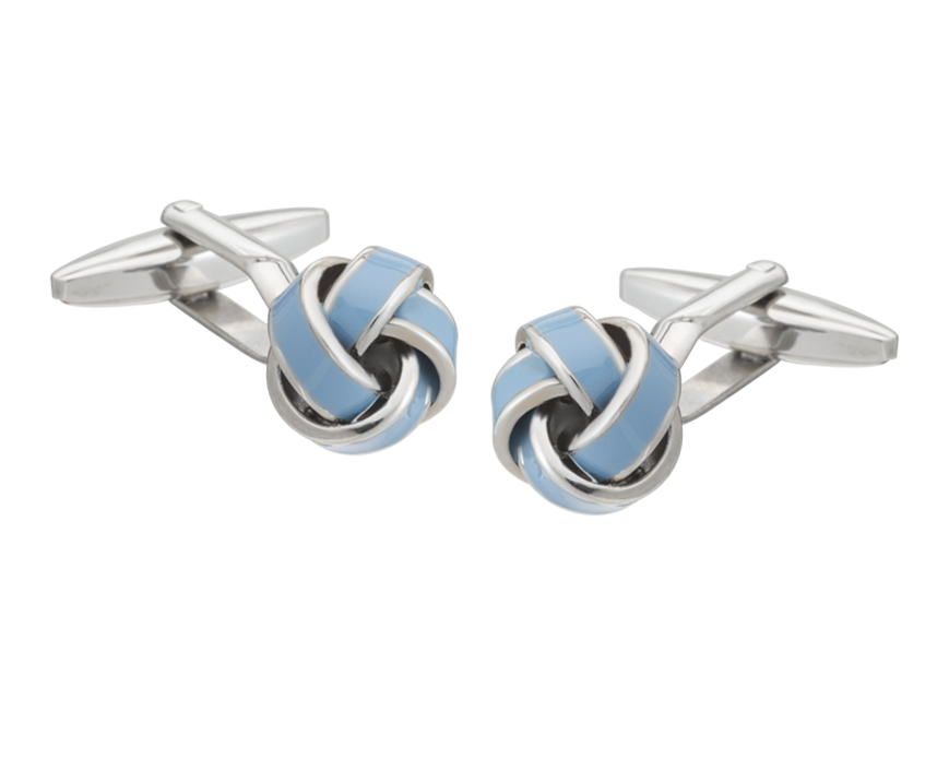 A modern take on a classic shape, these traditional knot cufflinks are embellished with a striking light blue enamel inlay. A statement of elegance and sophistication they team perfectly with our Blue Daisy Do Silk Pocket Square included in this Christmas Gift set.