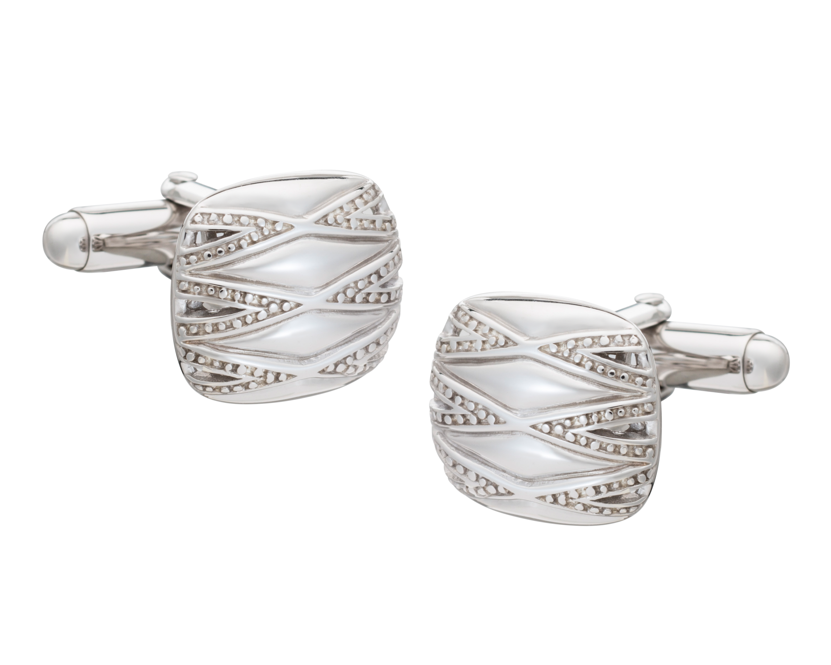 Showcasing a soft square shape, this pair of solid silver cufflinks is detailed with a delicate pattern of crossed lines and dots reminiscent of the art deco era. Discreetly ornate they are a refined choice for formal styling.
