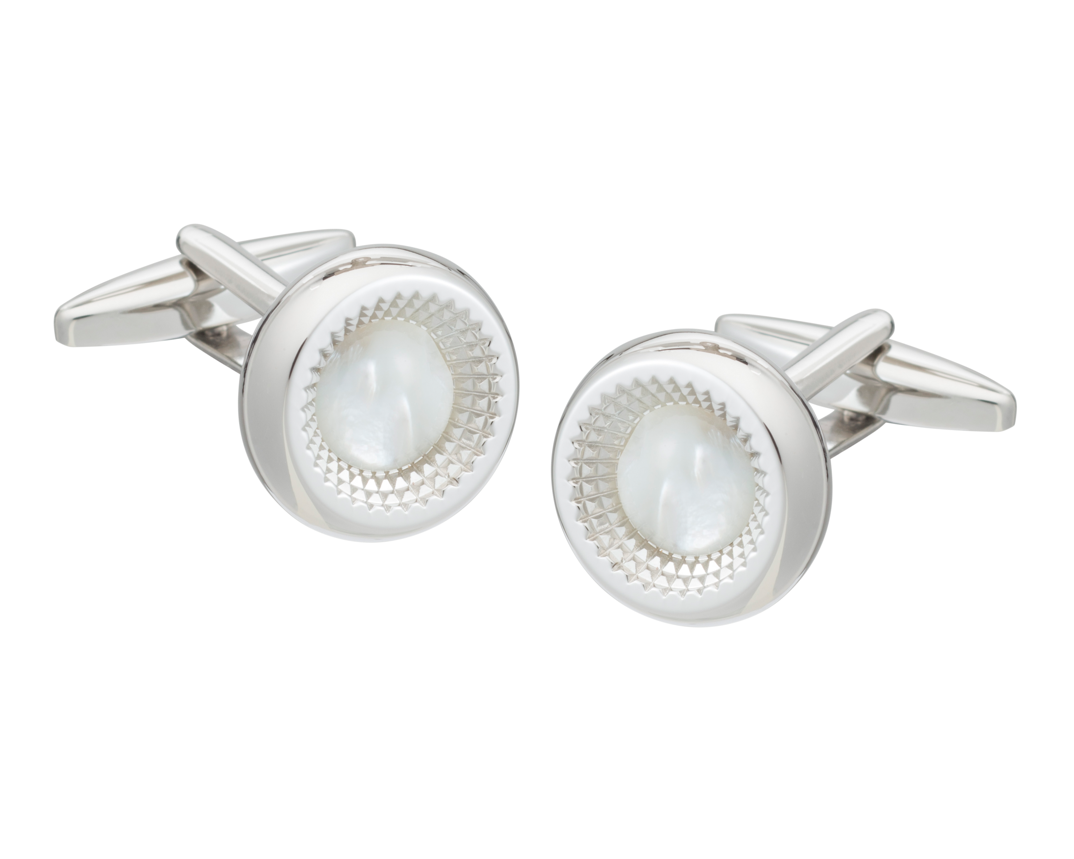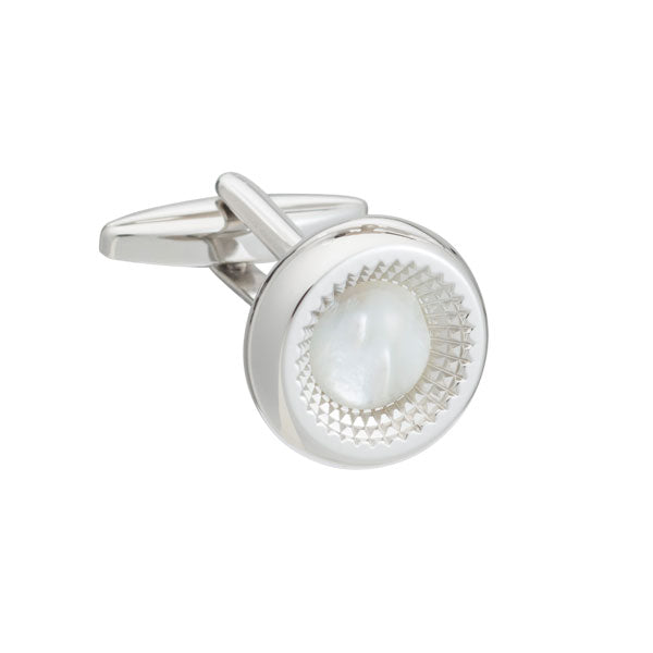 A beautiful mother of pearl stone is at the centre of these striking inverted, round cufflinks. Ideal for adding a contemporary style to your shirt they feature a smooth and polished outer casing with a contrasting inner pattern.
