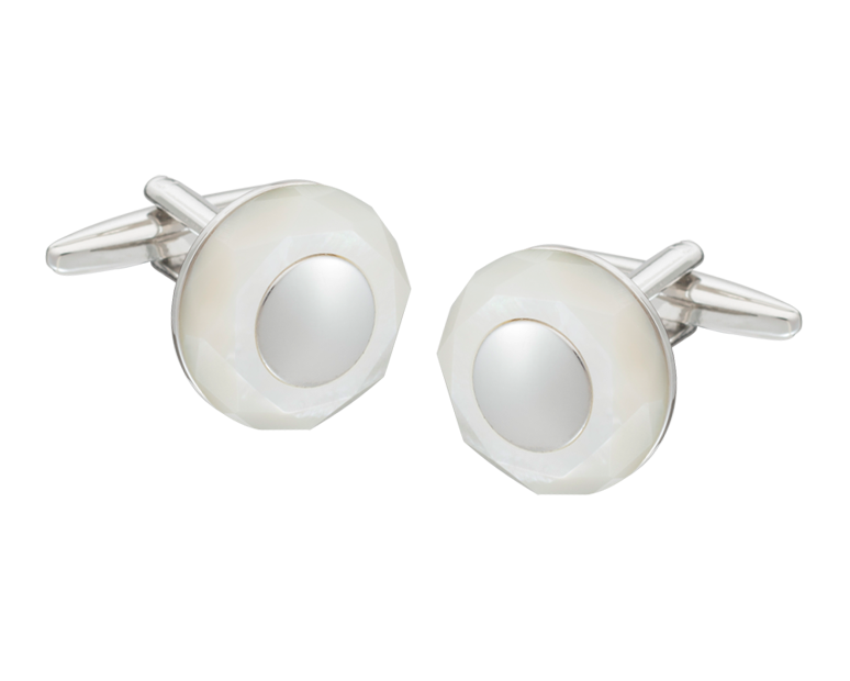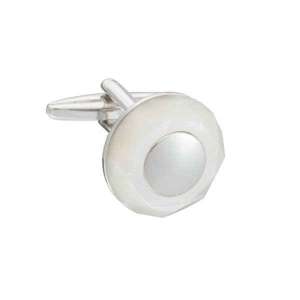 A faceted circle of semi-precious stone is at the heart of this distinctive round cufflink. Bright and clean, the mother of pearl creates an impressive focal point on the shirt sleeve, while the polished central piece adds to the luxurious finish.