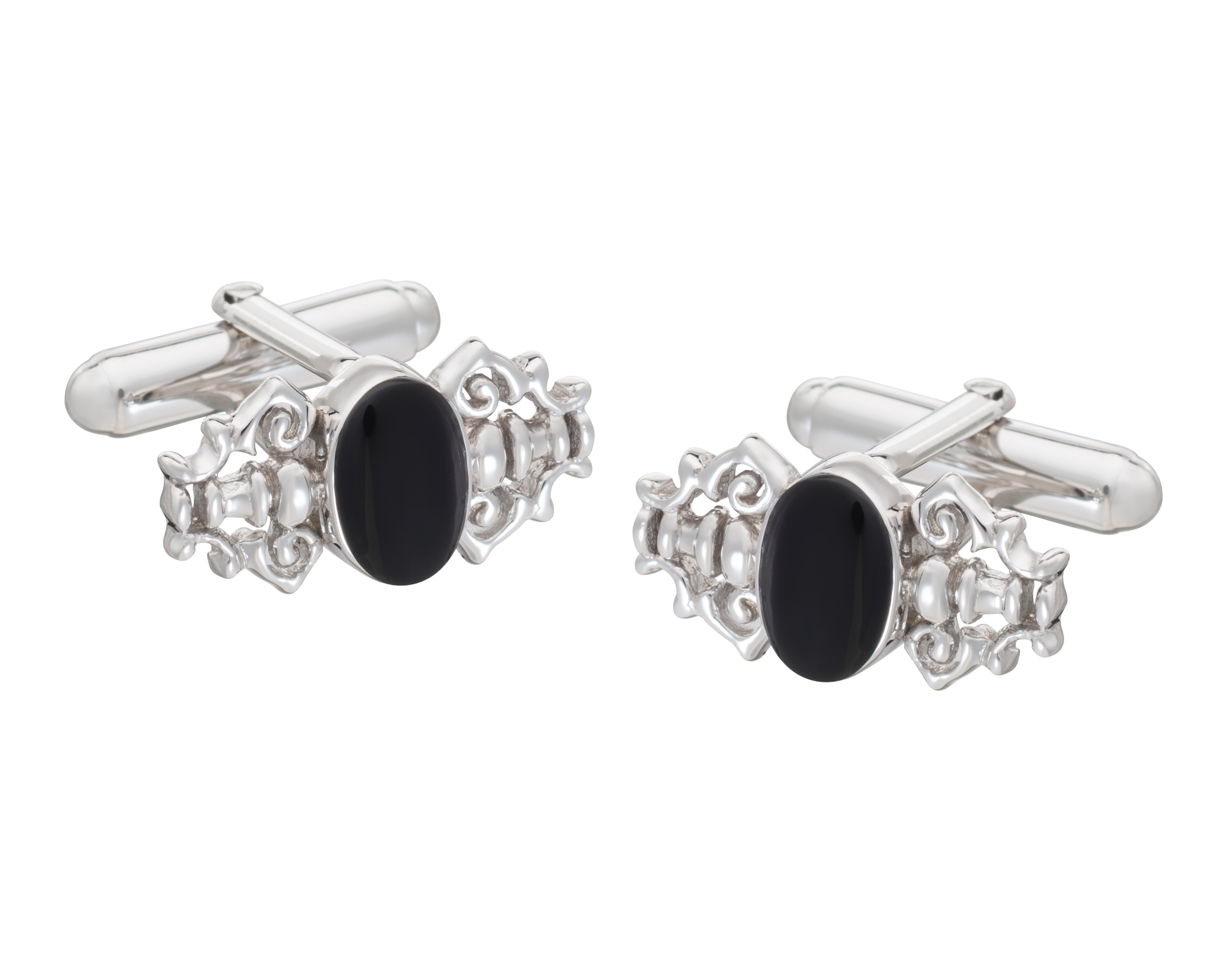 Influenced by the highly ornate and extravagant style of the baroque period these flamboyant cufflinks are work of art for the cuff. A smooth cabochon black onyx stone is flanked by intricate .925 sterling silver work to create a truly magnificent and majestic design. Perfect for adding a touch of luxury to your outfit.