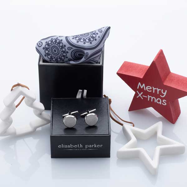 Simple, sleek and stylish the creative elegance of these 'O' shaped cufflinks contrasts a flat and smooth brushed metal front with a rounded and polished side, teamed with the classic paisley design of the silk pocket square in this Christmas Gift Set, he'll be a true Dapper Gent.