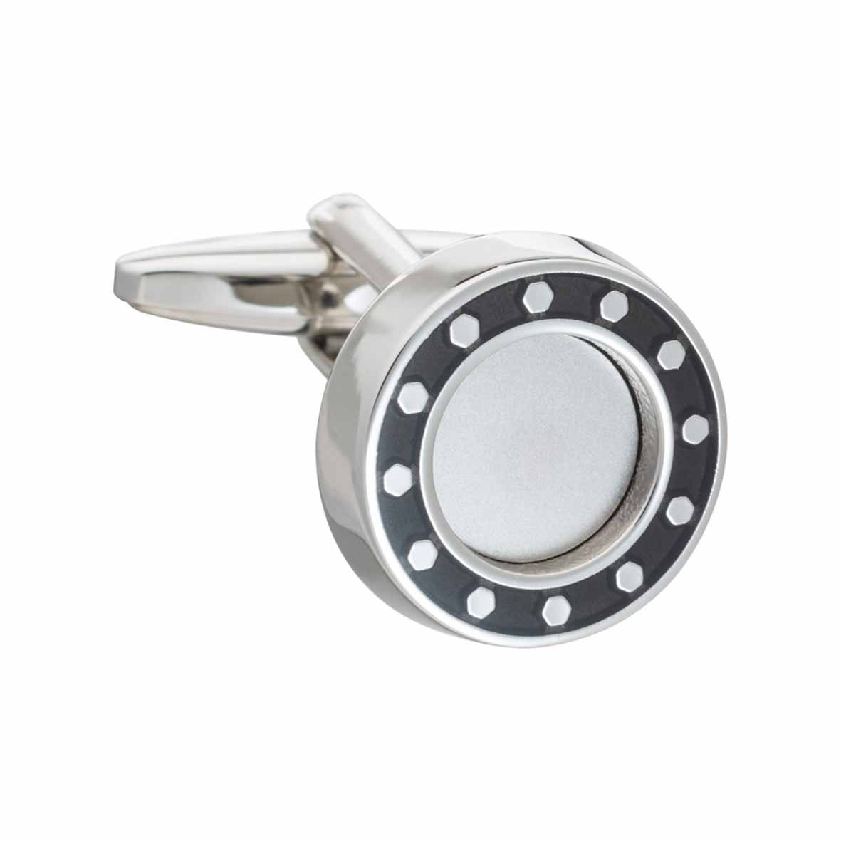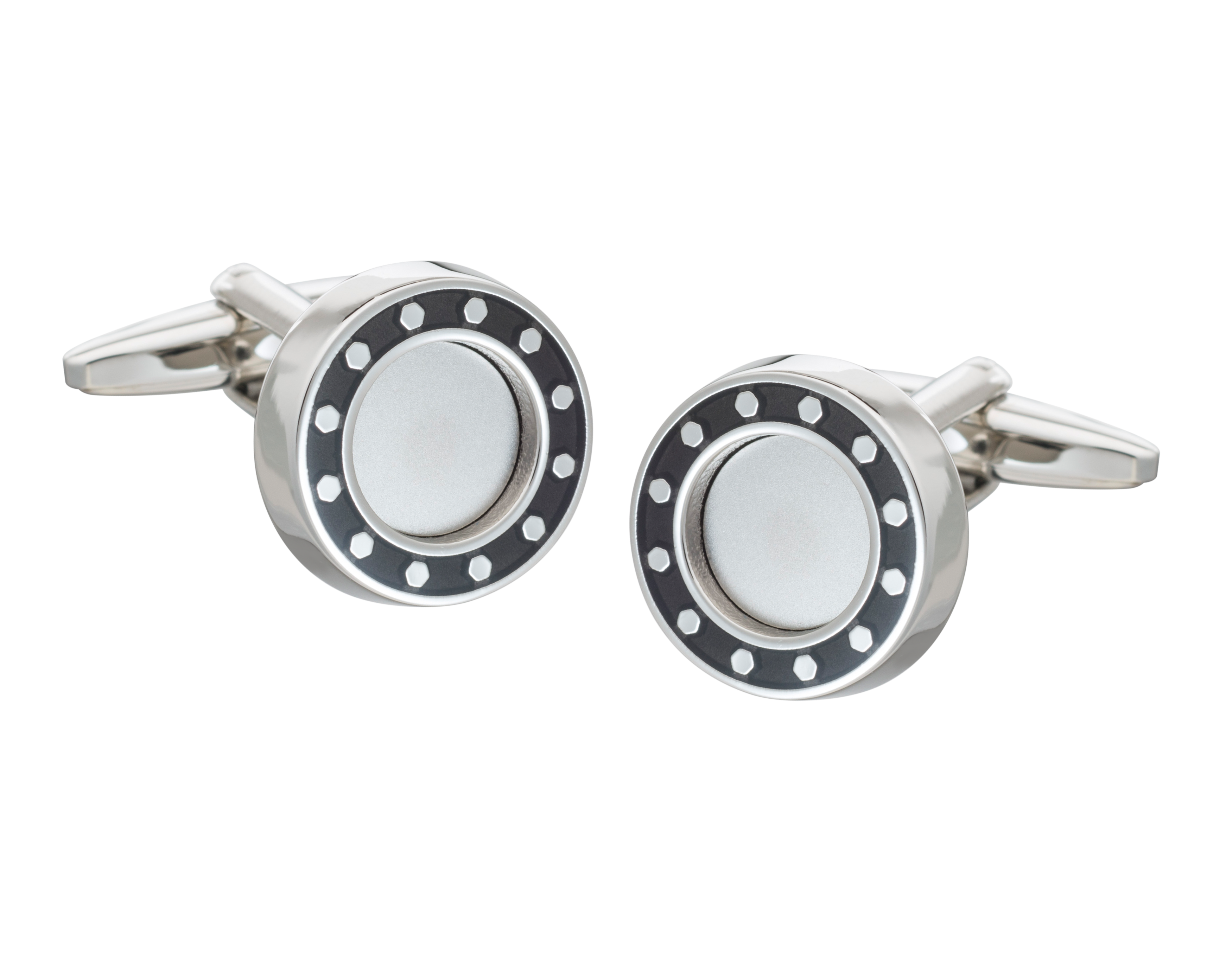 Centred with a sunken brushed metal core and a round profile these cufflinks are flanked by a raised black enamel surround with simply metal dots. Designed with a industrial feel, and a slightly chunkier form, they are reminiscent of mechanical components and make a great statement on your cuff.
