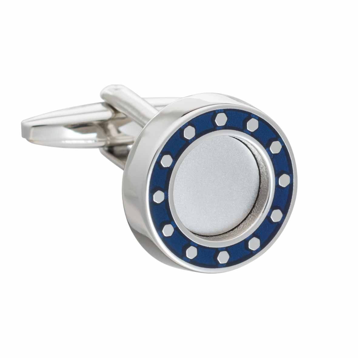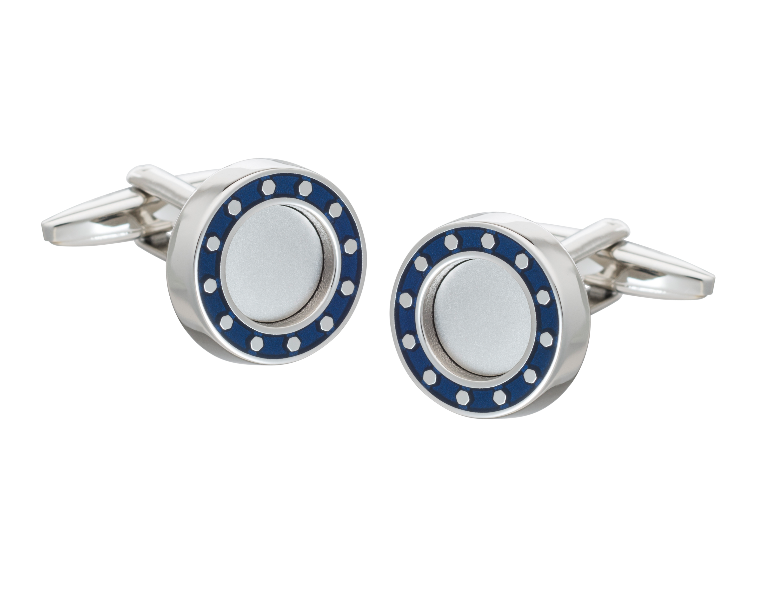 Centered with a sunken brushed metal core and a round profile these cufflinks are flanked by a raised navy blue enamel surround with simply metal dots. Designed with a industrial feel, and a slightly chunkier form, they are reminiscent of mechanical components and make a great statement on your cuff.