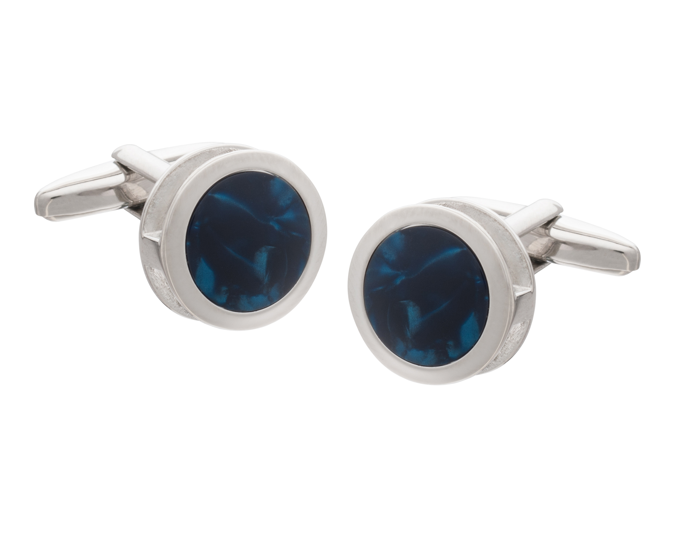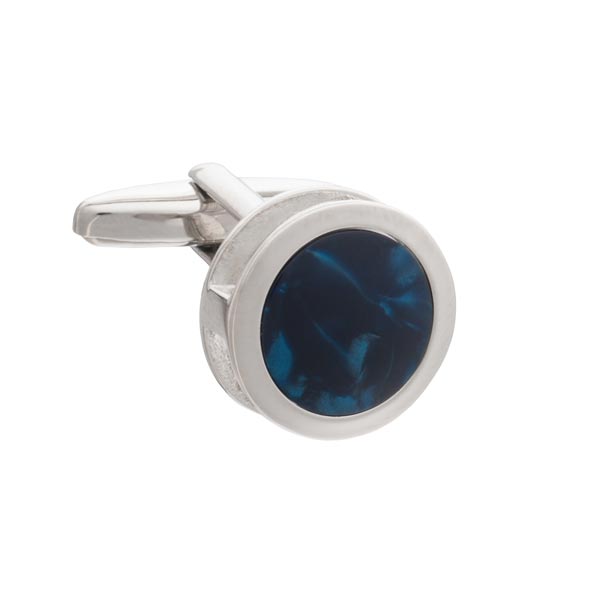 Packing a colourful punch, the magnificent hues of the blue celluloid are visible from all angles of these uniquely crafted, round metal plated cufflinks.