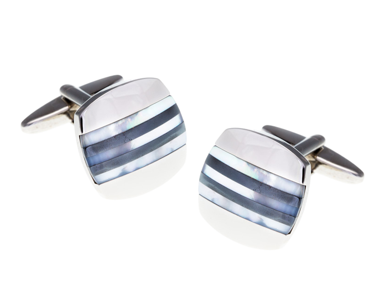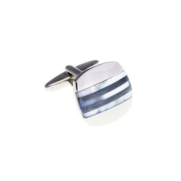 Beautifully simple stripes of mother of pearl and hematite enhance the splendour of these slightly cabochon cufflinks. With an expertly polished finish they are classy and stylish.