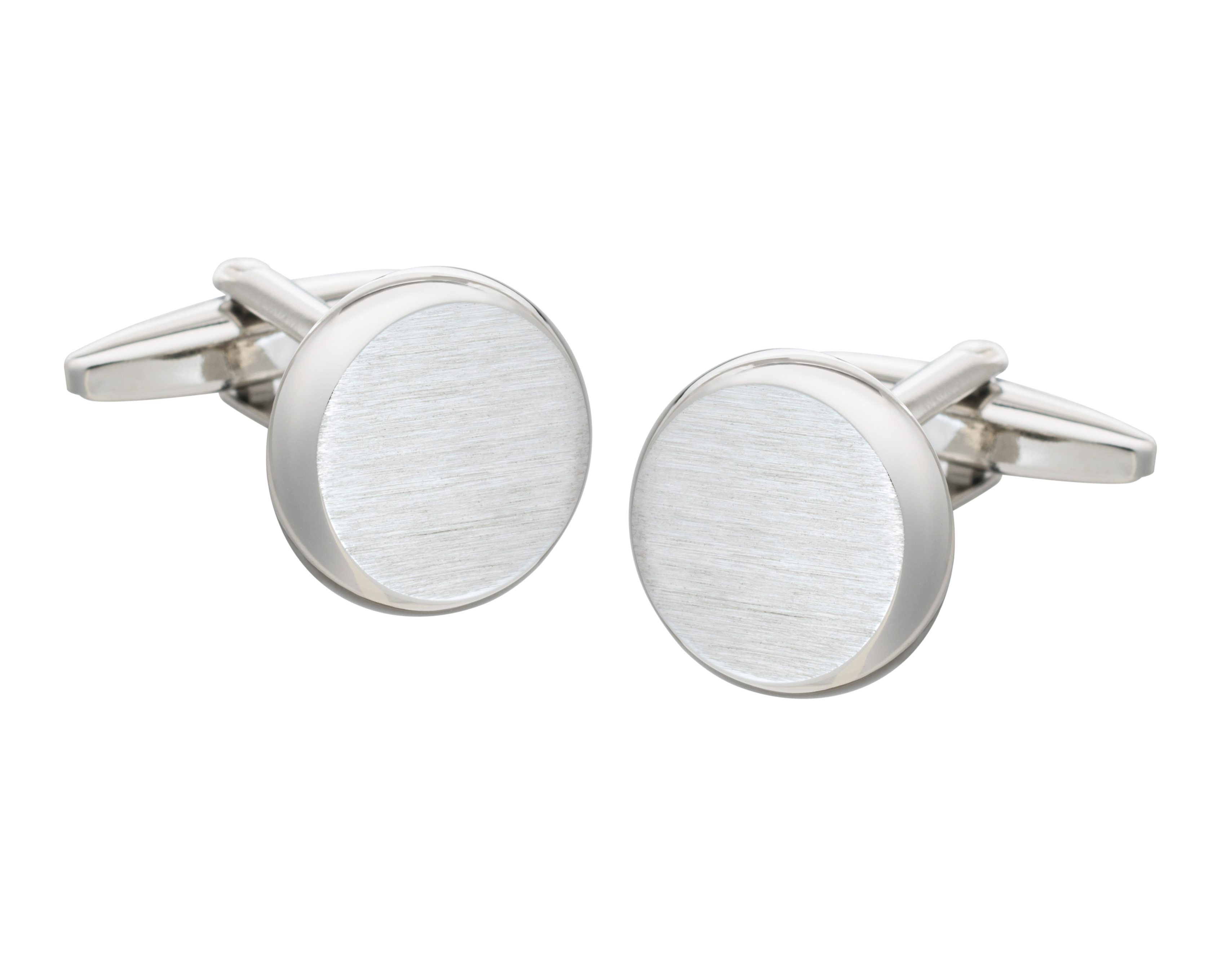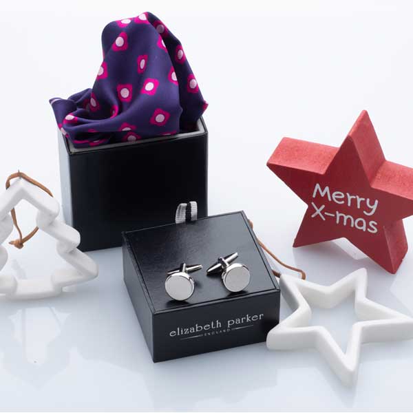 Simple, sleek and stylish the creative elegance of these 'O' shaped cufflinks contrasts a flat and smooth brushed metal front with a rounded and polished side, team with the pink Daisy Do Silk Pocket Square in this Christmas Gift Set for a playful look.