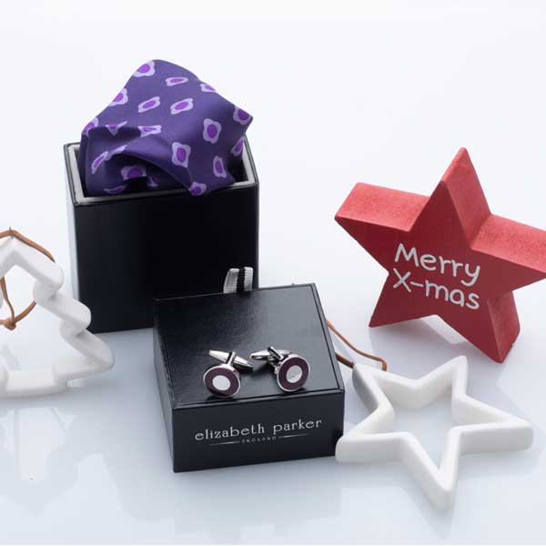 A beautiful Fleur de lys pattern is embossed on an enamel insert to give these round purple cufflinks a strong heraldic feel. Striking in colour, they certainly won’t go unnoticed when worn, especially when teamed with the quirky design of the Daisy Do Silk Pocket Square included in this Christmas Gift Set.