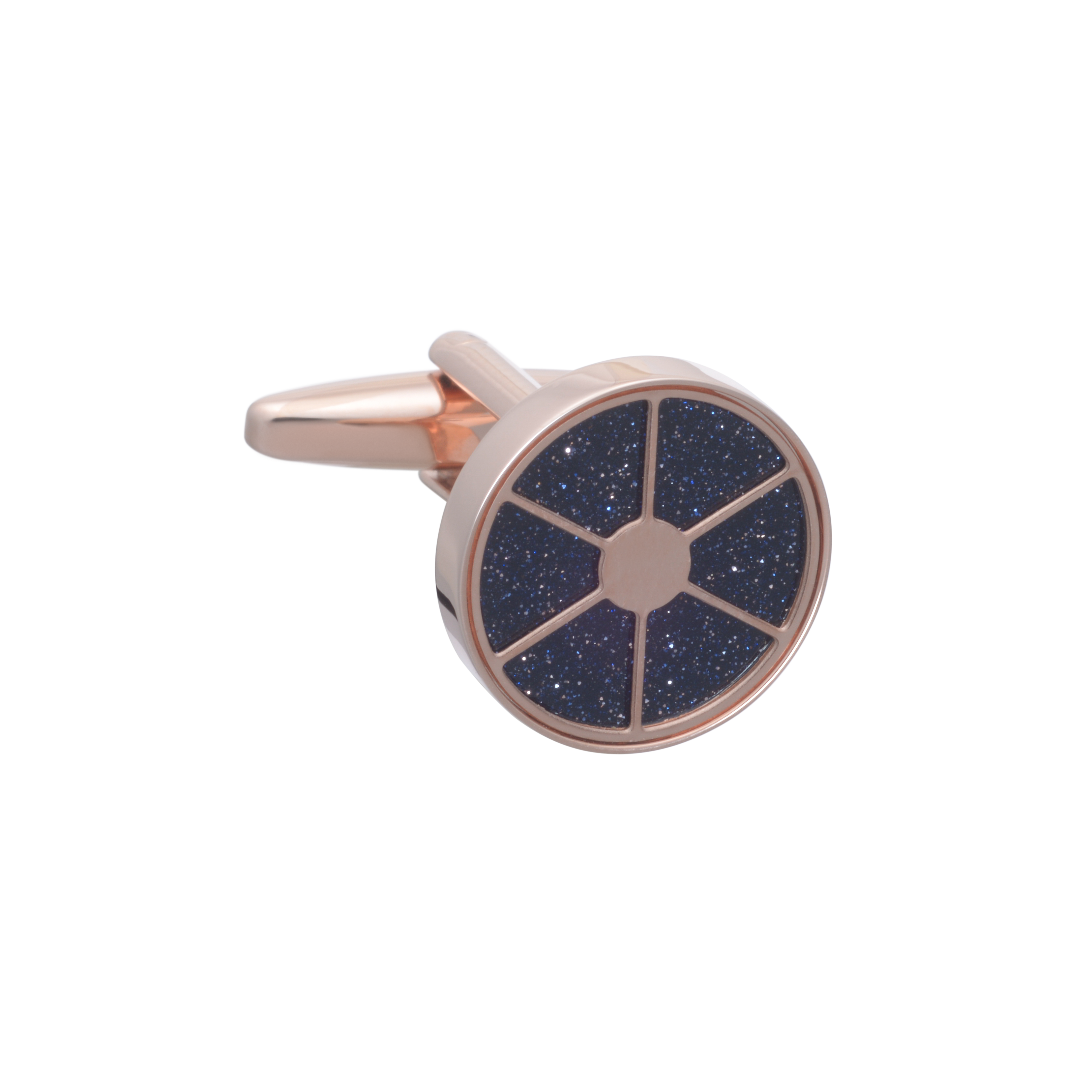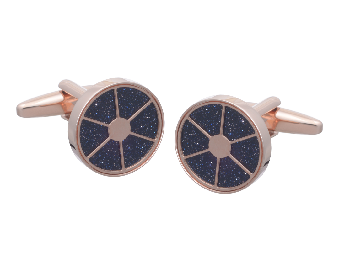 A glorious showcase of Blue Goldstone and Rose Gold with a subtle hint of sparkle to really make the segments shine. This pair of round cufflinks are Inspired by the many segments of life. The Perfect accessory for grooms and businessmen alike. AW 2023’s Elizabeth Parker favourite.
