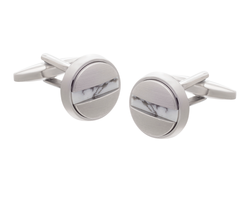 The mix of metal and precious stone gives these slotted screw head cufflinks a modern accent. The complementary colours of brushed metal and howlite produce a striking round cufflink that will definitely make its mark on your sleeve.