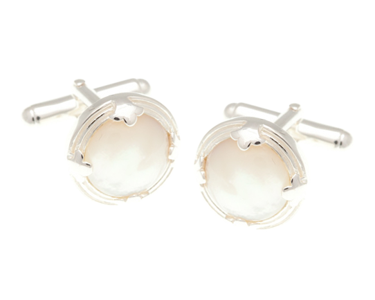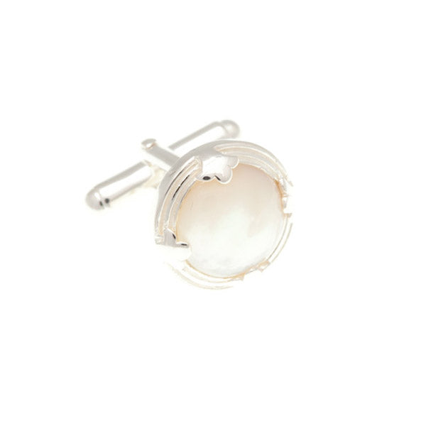 Vintage inspired, these stunning round cufflinks feature a polished mother of pearl stone within an intricately designed leaf edged solid silver casing.