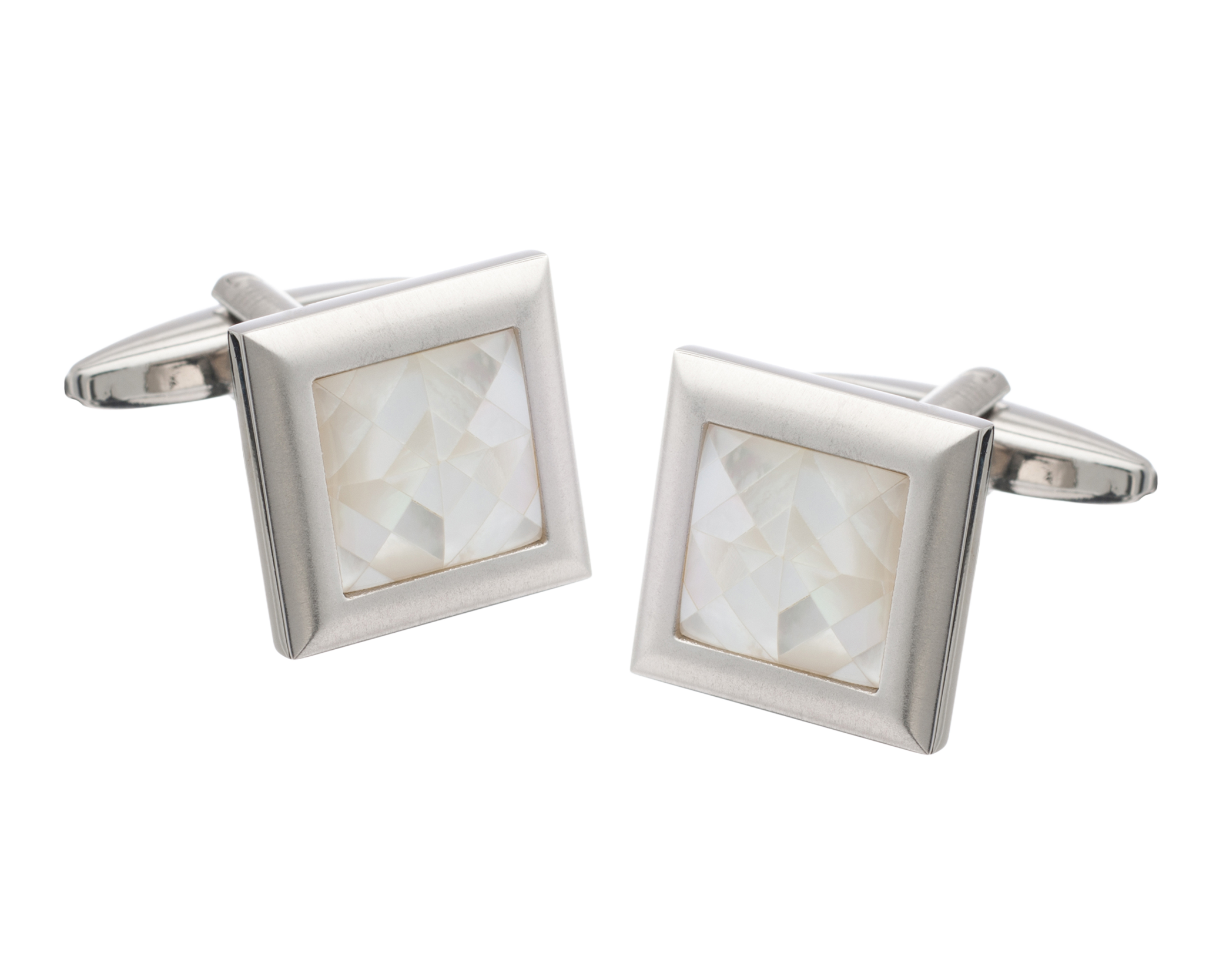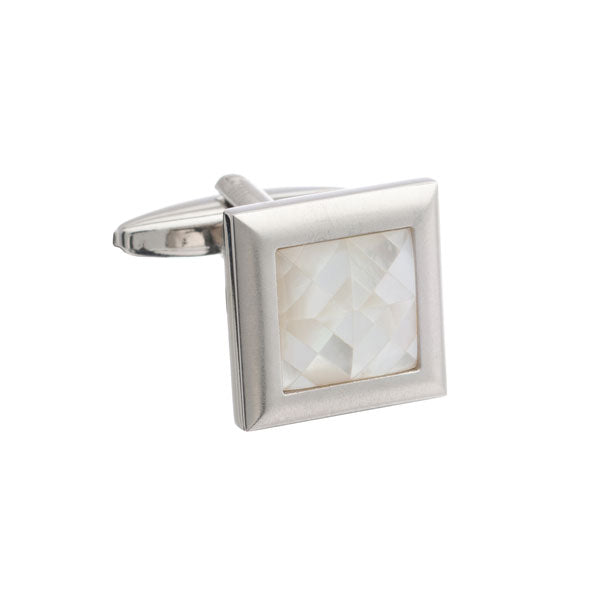 Encased by a brushed metal square outer, pieces of white Mother of Pearl create a spider's web effect in these Semi Precious Stone cufflinks by Elizabeth Parker. The intricate design and delicate colour of the mother of pearl make them ideal groom's cufflinks.