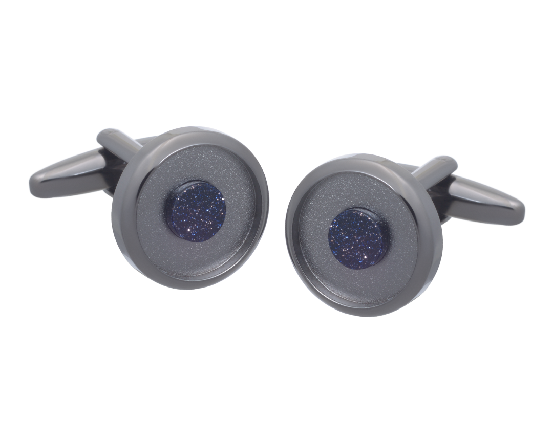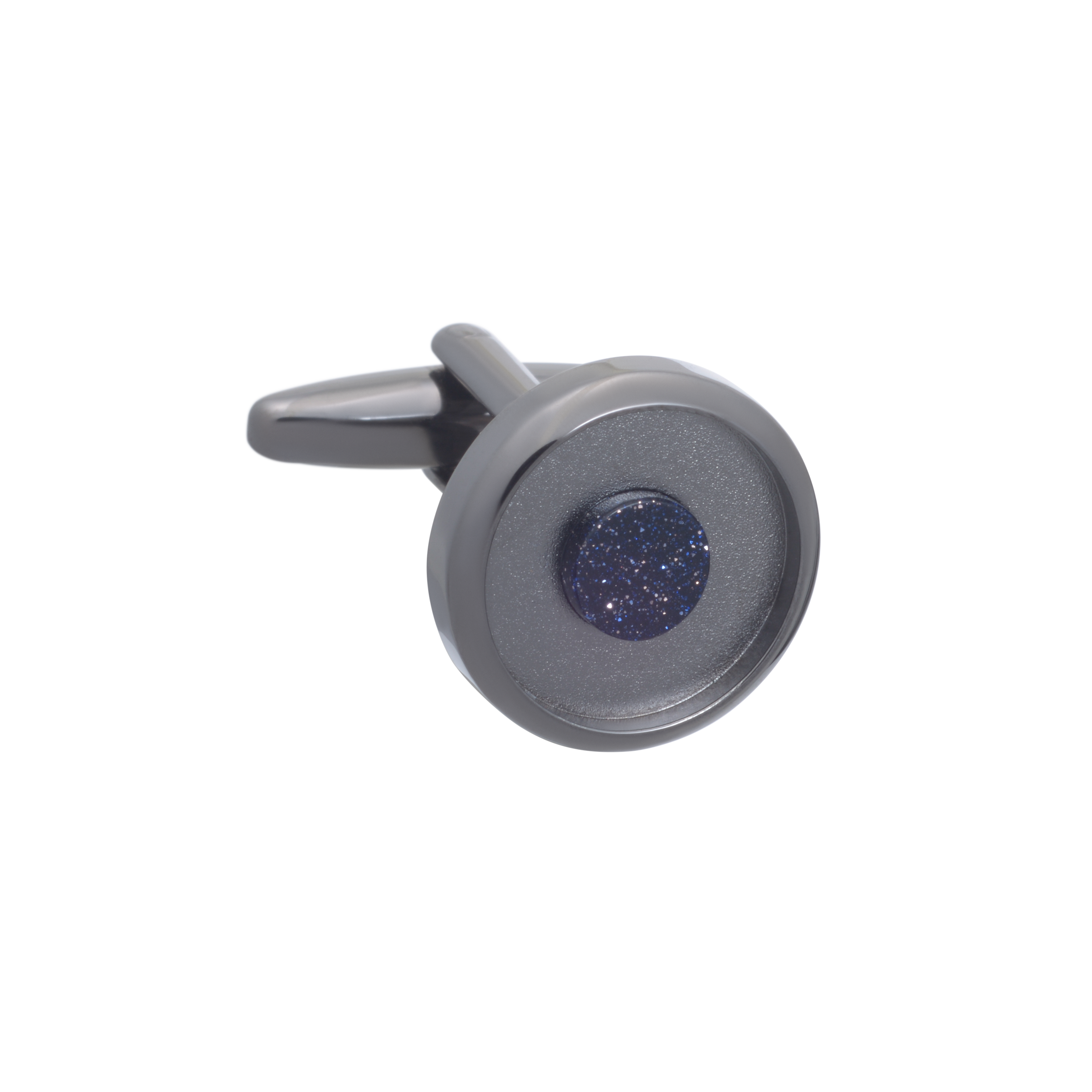 Inspired by formalwear accessory designs from the past, these subtly exuberant round cufflinks feature a core hint of Blue Goldstone against a Gunmetal casing. The inside detail creates dimension.