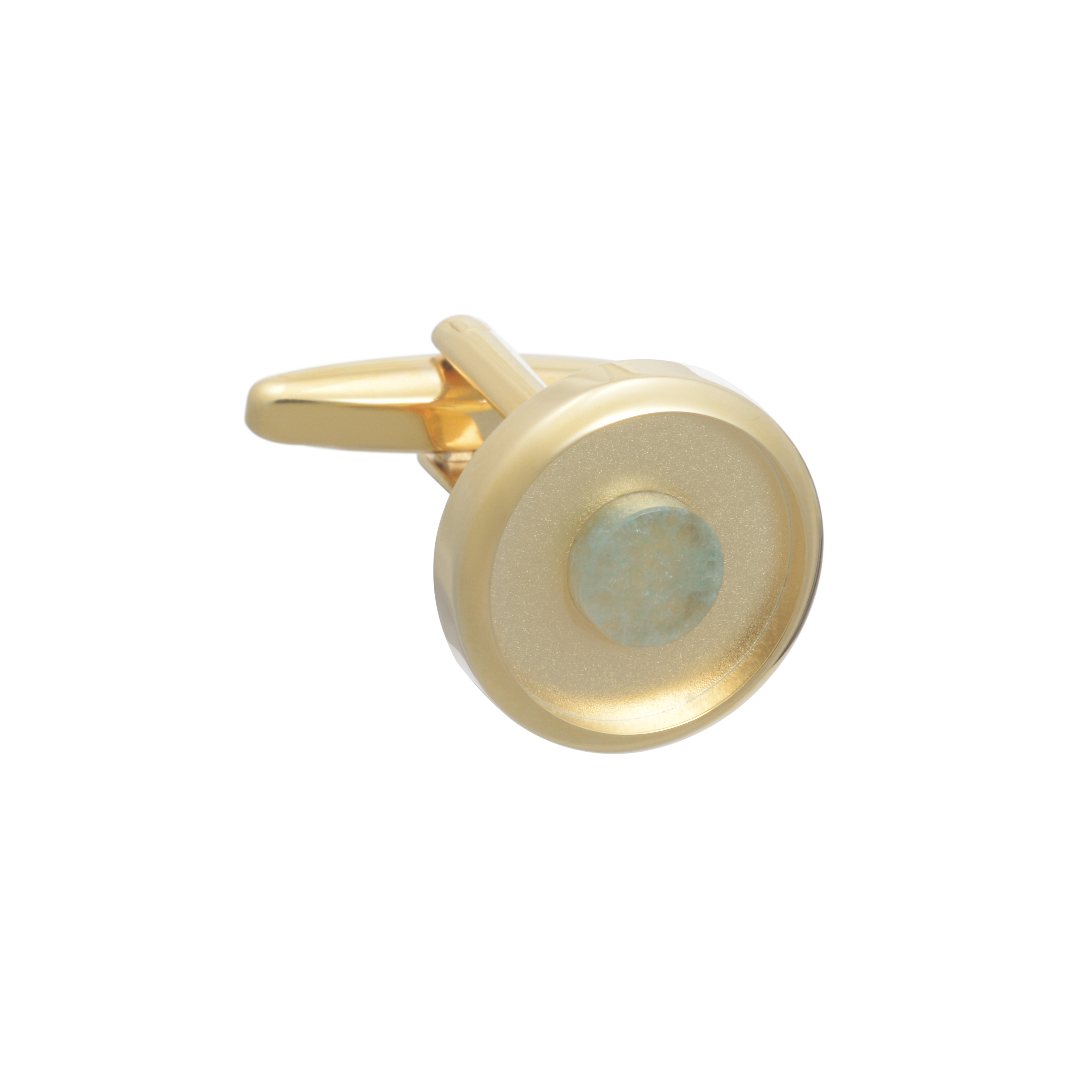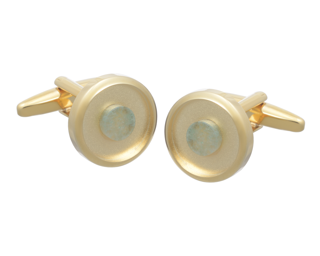 Inspired by formalwear accessory designs from the past, these subtly exuberant round cufflinks feature a core hint of Green Aventurine against a Gold casing. The inside detail creates dimension.