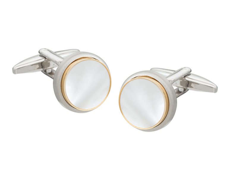 A truly classic design, these delightful mother of pearl with gold edging and brushed metal round cufflinks will add a refined accent to any shirt. Suave and sophisticated the contrasting colours and finishes are a statement of elegance and luxury. Perfect for any special or formal occasion.