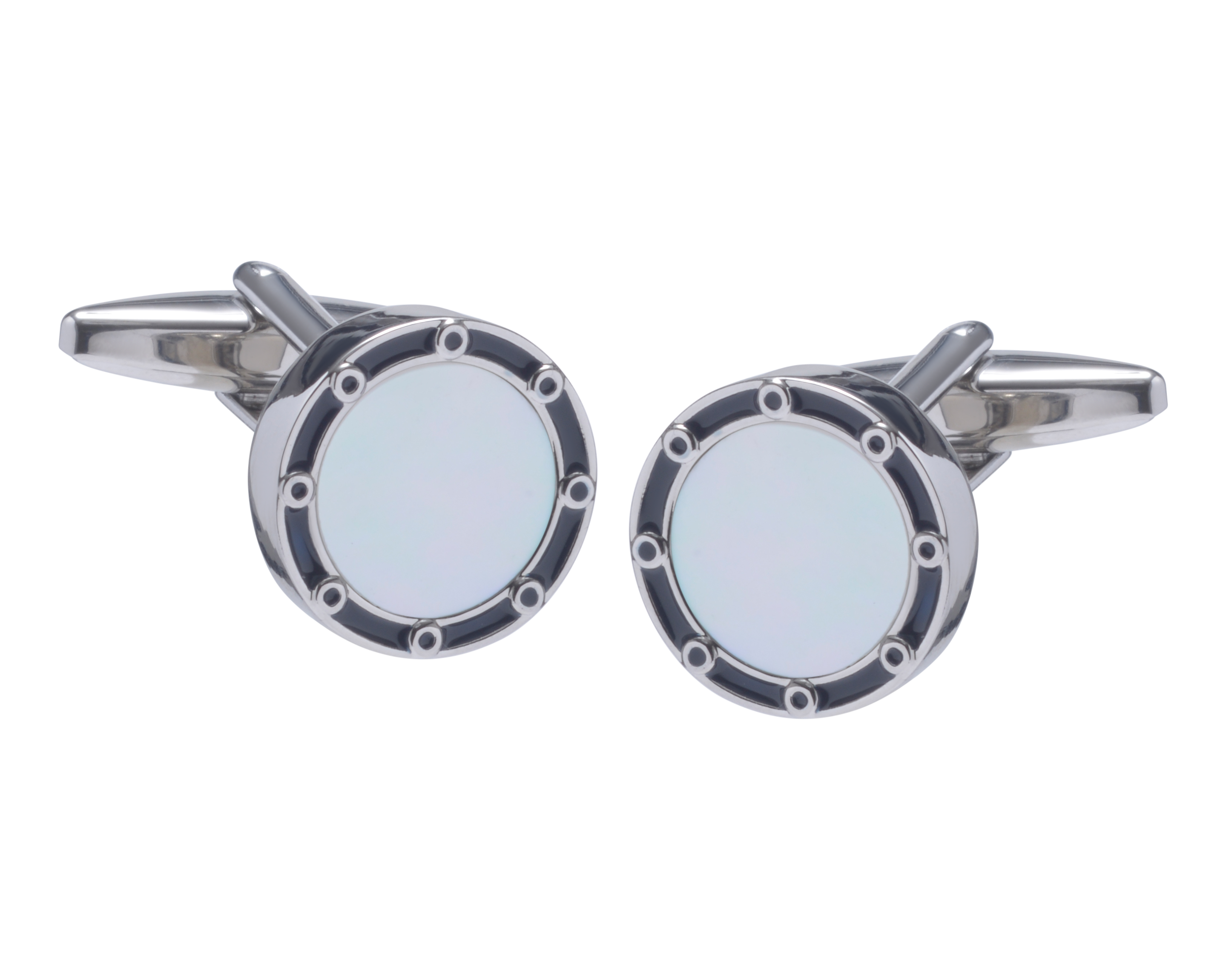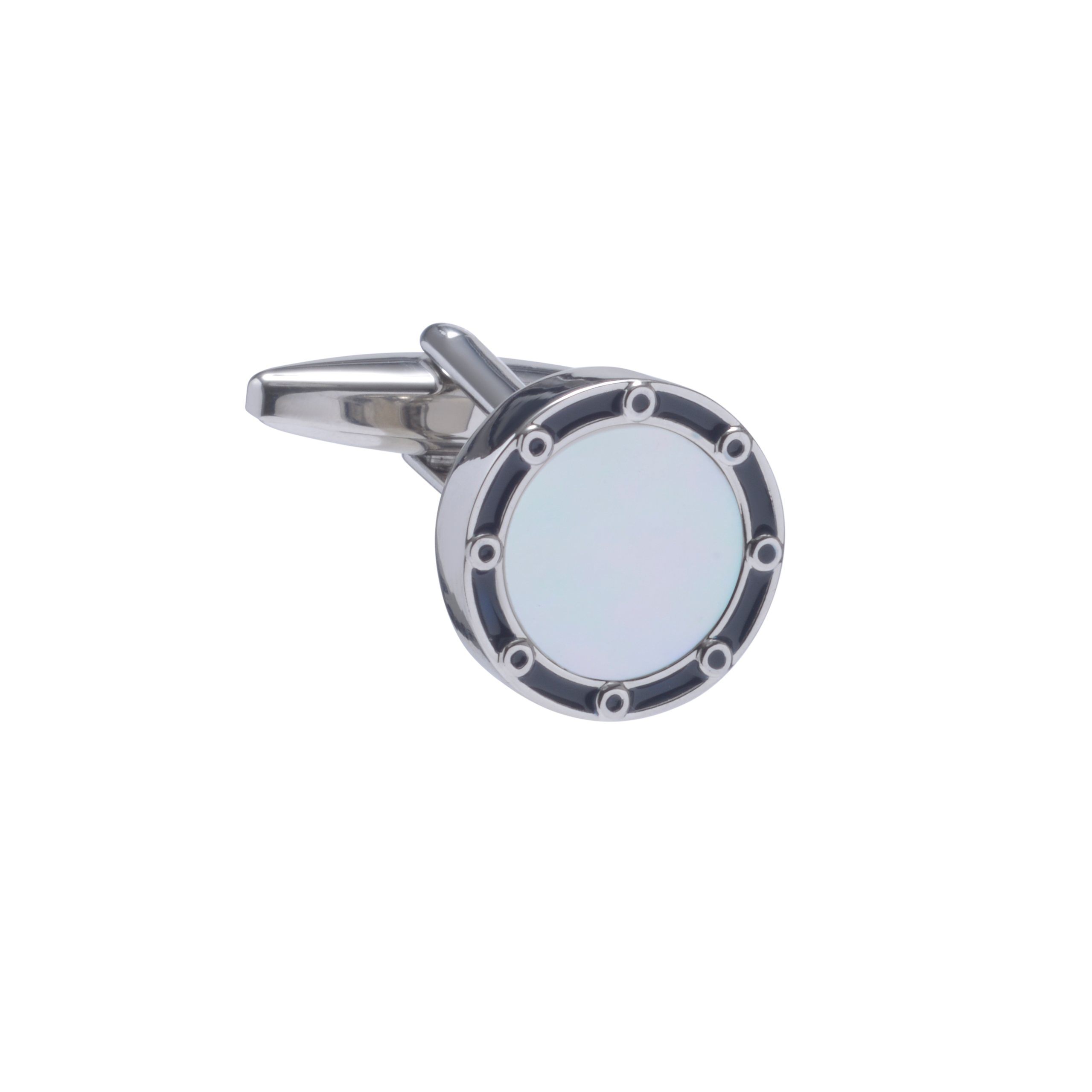 A porthole to success, these stunning cufflinks feature a classic black enamel rim and Mother of Pearl centre. The enamel edge is adorned with small circles to create a porthole like finesse.