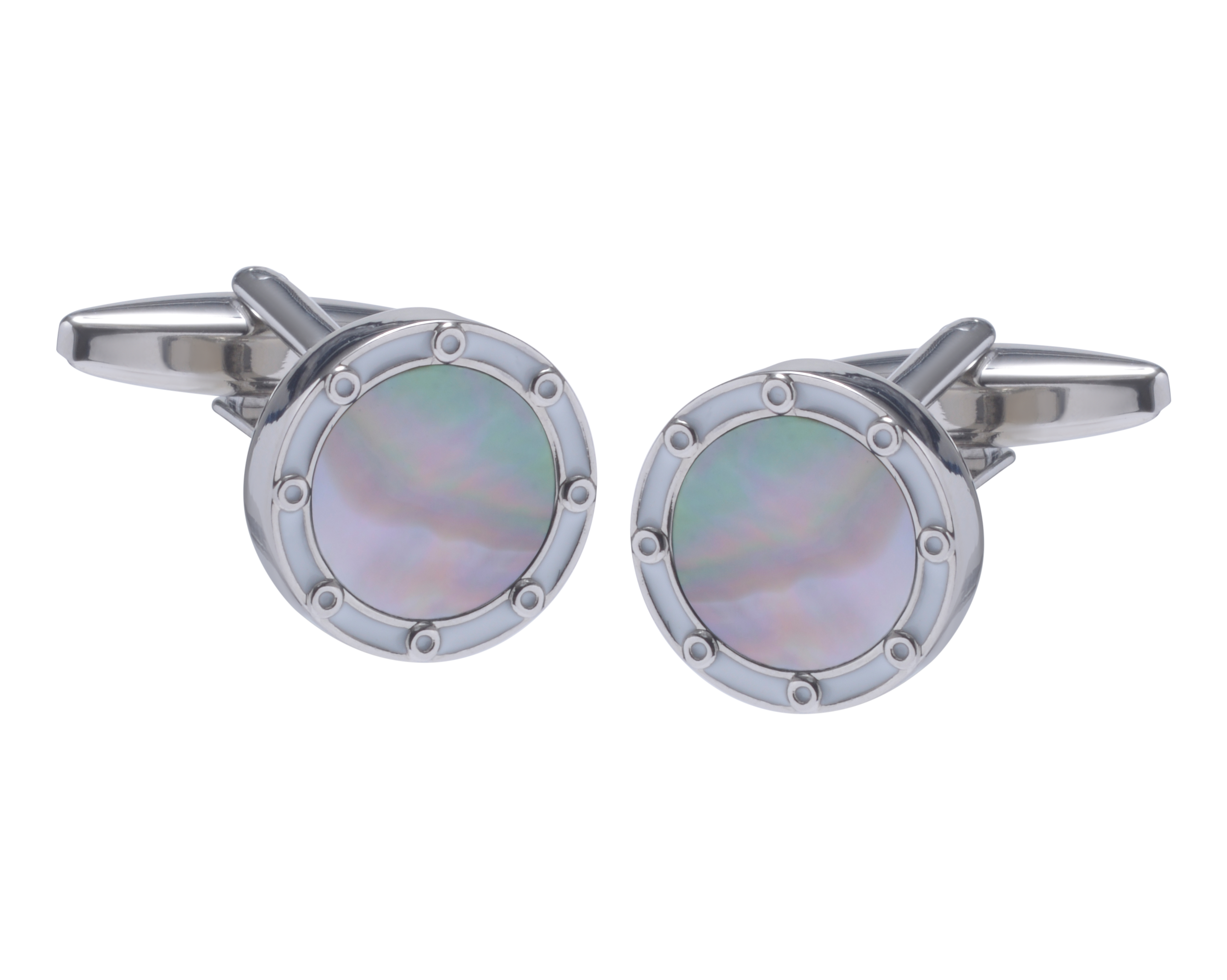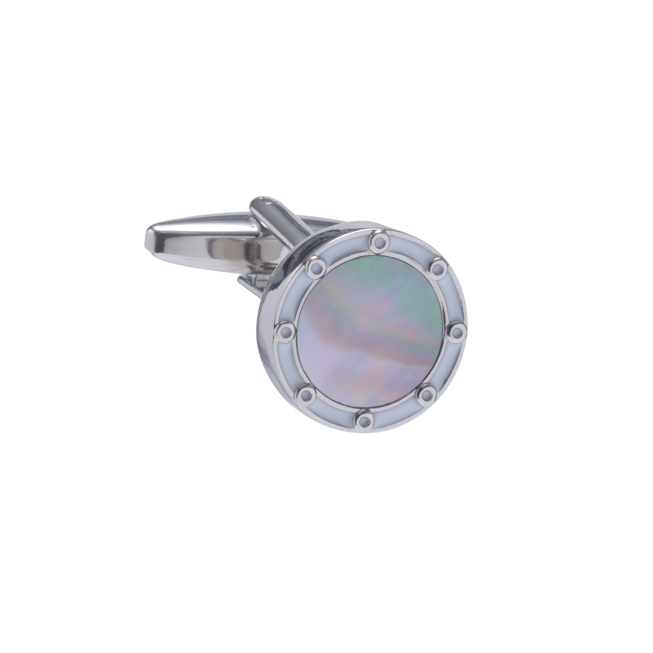 A porthole to success, these stunning cufflinks feature a White Enamel edge and Smokey Mother of Pearl centre. The enamel edge is adorned with small circles to create a porthole like finesse.