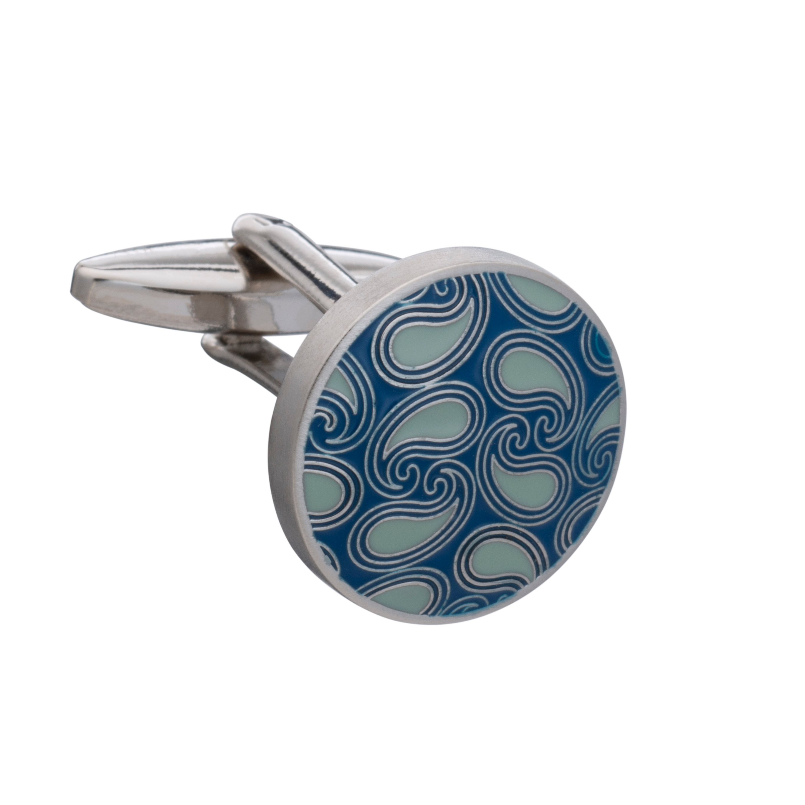 A beautifully embossed, contemporary paisley pattern gives these blue cufflinks a subtle flamboyant feel. A striking design to really make your personality shine.