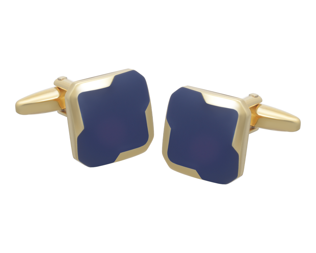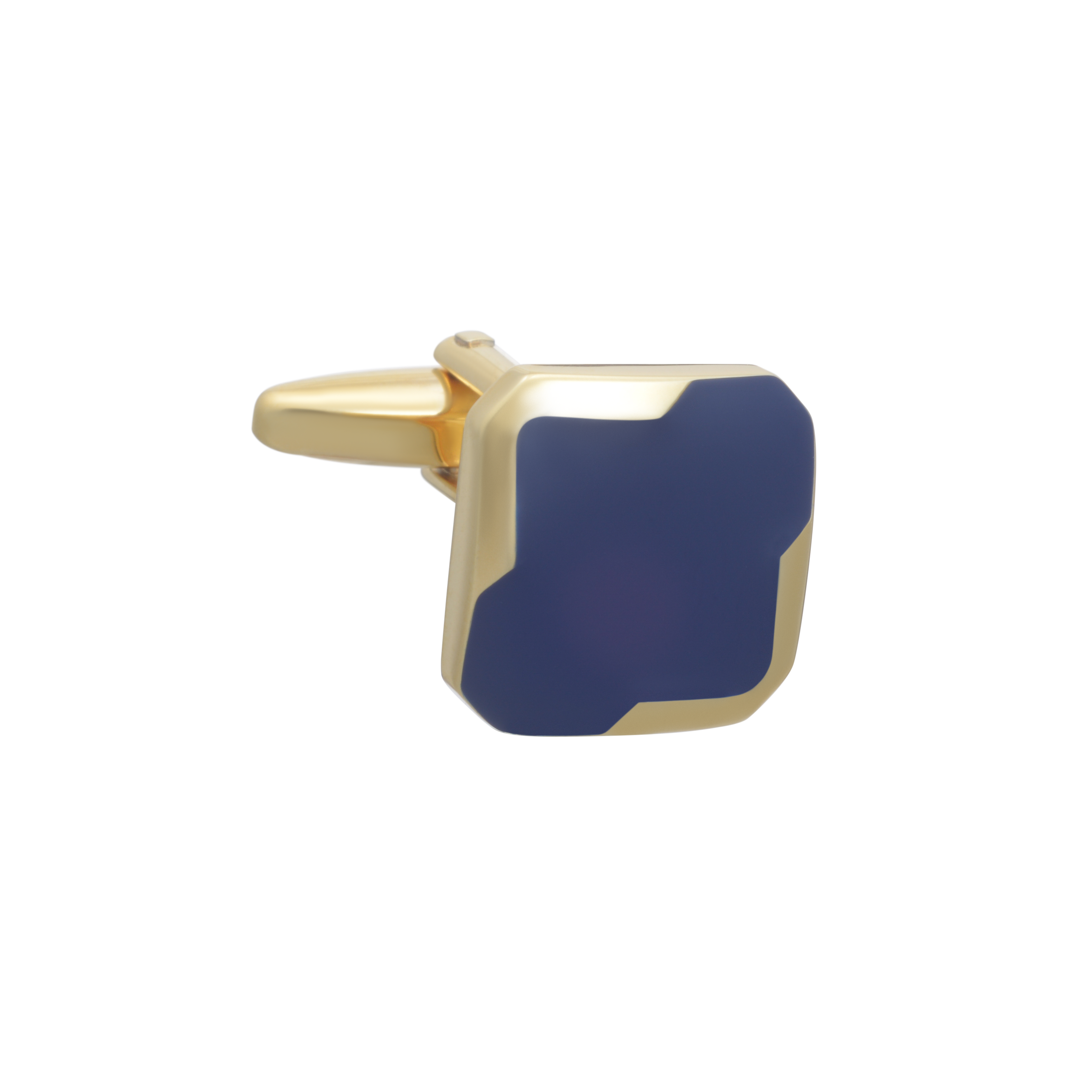 These unique soft edged square cufflinks feature a contemporary interpretation of art deco design. Combining a navy enamel with a gold frame. An impeccable piece to elevate a formal look.