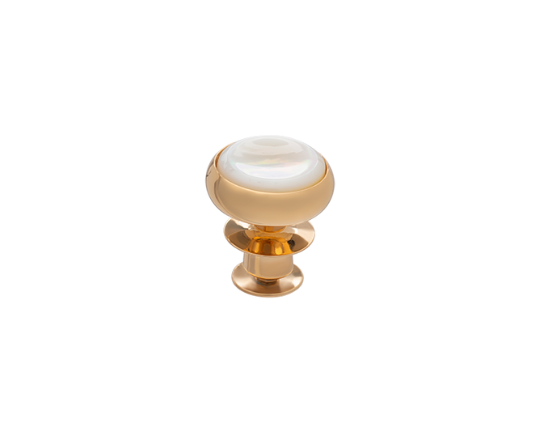 A twist on a timeless design, Signature No2 has a delicate diameter of 14mm and features an ethereal Mother of Pearl stone that protrudes from the edge of the gold casing before dropping down to create a slight concave dip.