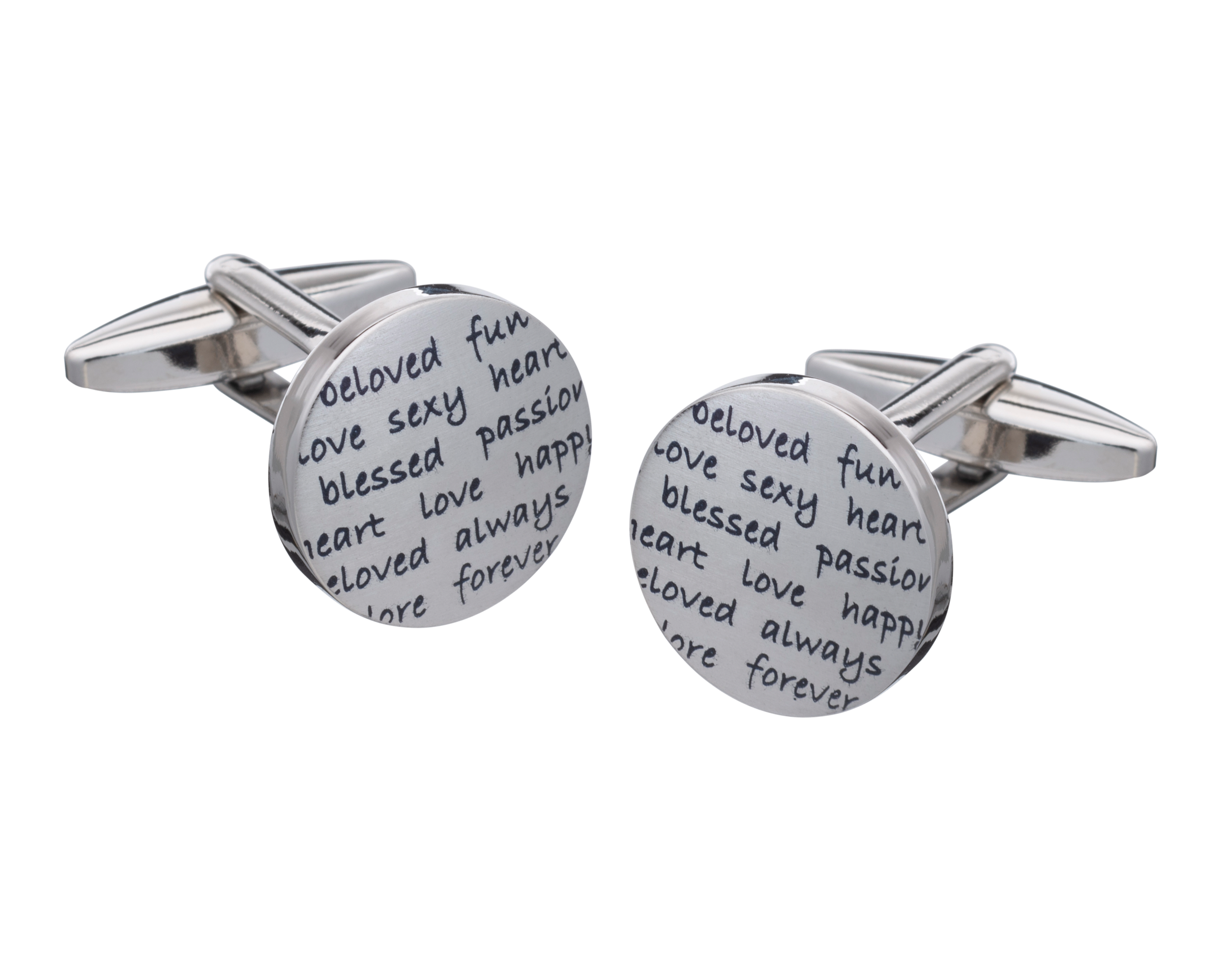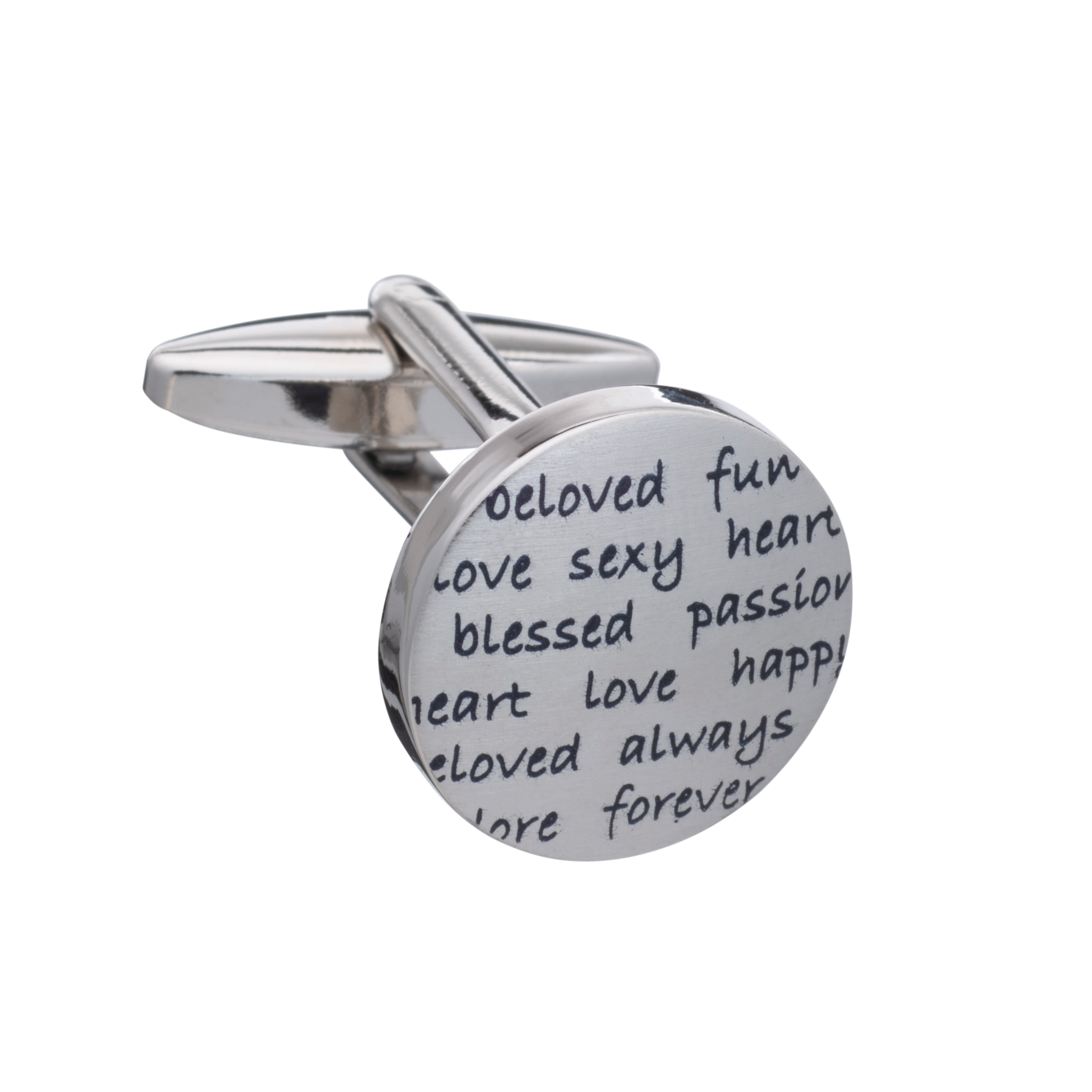 Let these elegant word cufflinks do all the talking. The union of black lettering and brushed metal forms the perfect finishing touch to any special outfit.