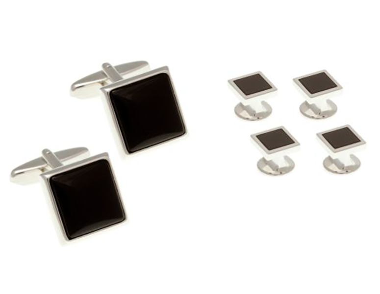 The perfect formal black tie event accessories - 4 square black onyx dress studs and matching cufflinks - wonderfully classic on a formal crisp white dress shirt.