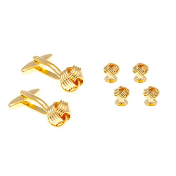 A stunning addition for any formal black tie occasion - 4 gold plated dress studs and matching cufflinks in a intricate woven knot design - wonderfully classic on a crisp formal white dress shirt.