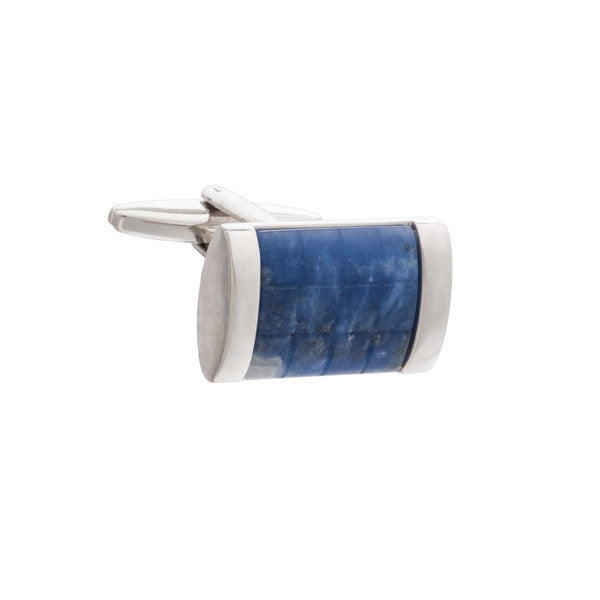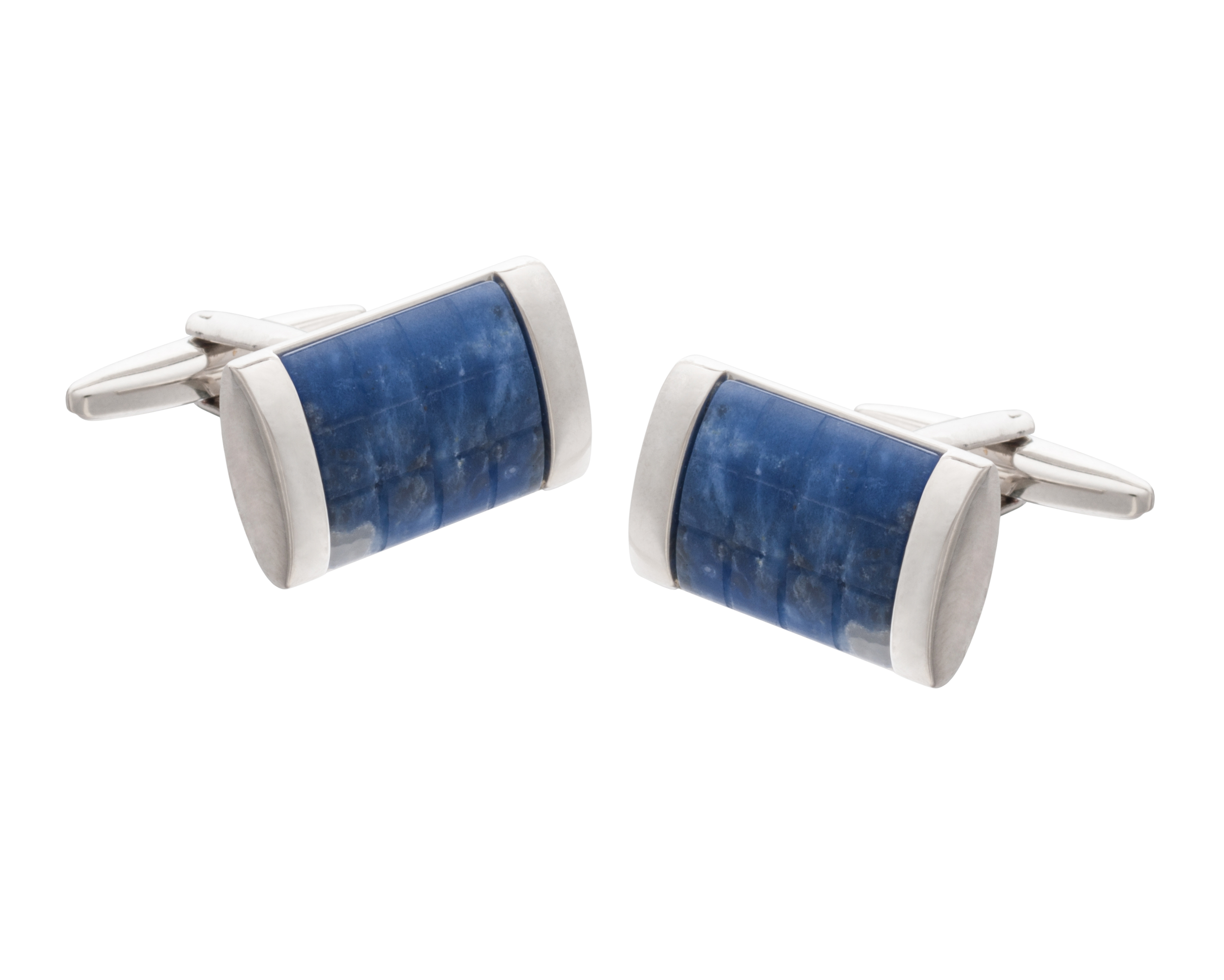 These polished Sodalite and metal elliptical cylinder shaped cufflinks, with delicately engraved pattern, combine a sense of extravagance with distinguished design. Perfect for any big occasion.