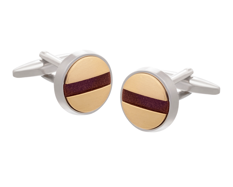 The mix of metal and precious stone gives these slotted screw head cufflinks a modern accent. The complementary colours of gold plate and goldstone produce a striking round cufflink that will definitely make its mark on your sleeve.