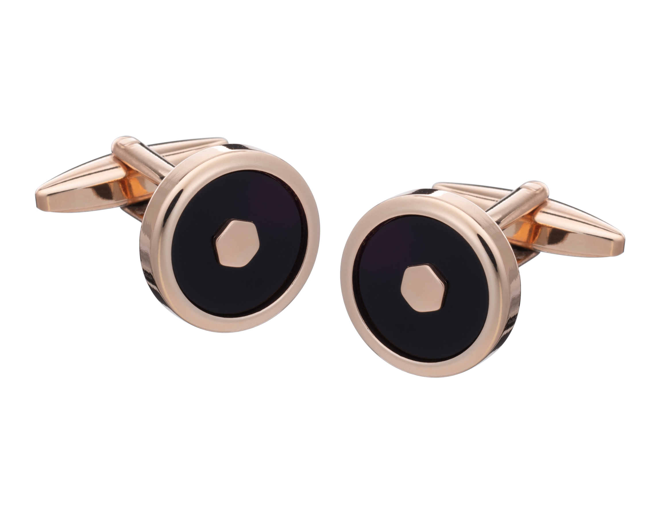The new modern classic. Showcasing a popular mix of Black Onyx and Rose Gold. These round cufflinks are the definition of luxury and class.