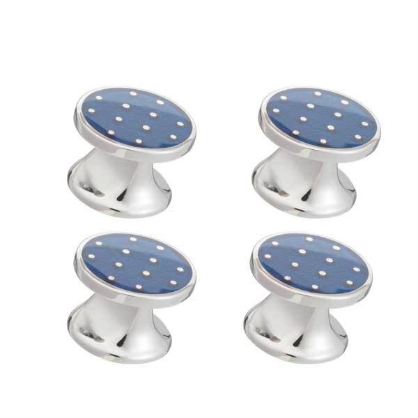 Jovial, yet dressy, these super blue enamel polka dot dress studs are perfect for any black tie formal occasion where a formal dress shirt is required. Team with the matching round cufflinks for a fully co-ordinated look. Offering an alternative to black, they are sure to stand out from the crowd at any black tie dress code event.