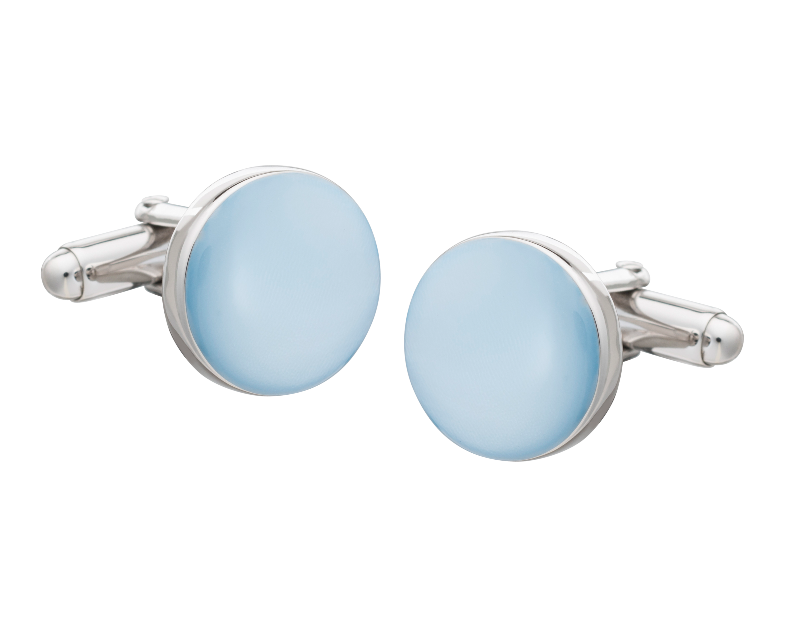 The iridescent surface of these smooth and round blue mother of pearl cufflinks makes them reminiscent of a full moon. Clean and bright they are sure to stand out on your shirt cuff.