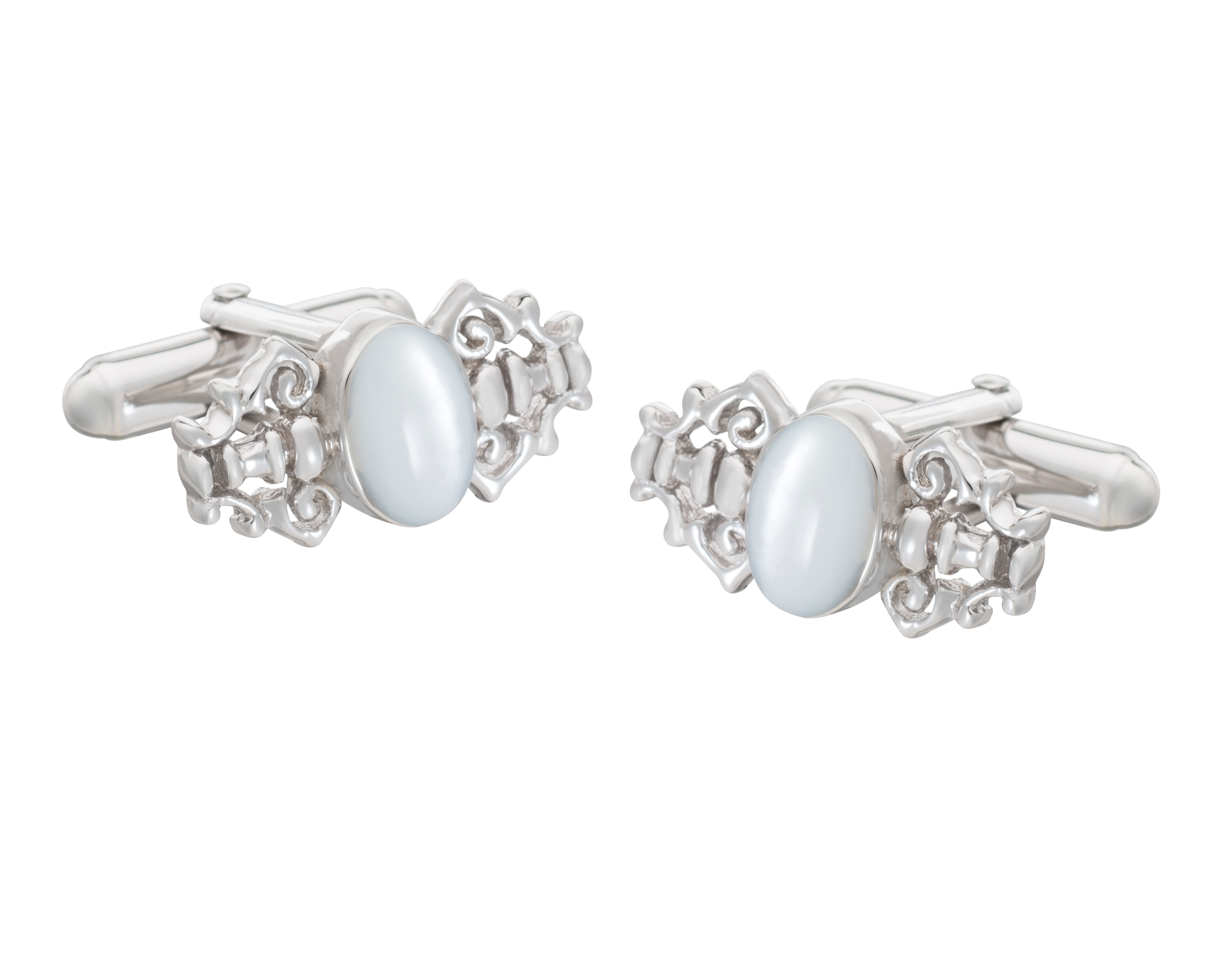 Influenced by the highly ornate and extravagant style of the baroque period these flamboyant cufflinks are work of art for the cuff. A smooth cabochon mother of pearl stone is flanked by intricate .925 sterling silver work to create a truly magnificent and majestic design. Perfect for adding a touch of luxury to your outfit.