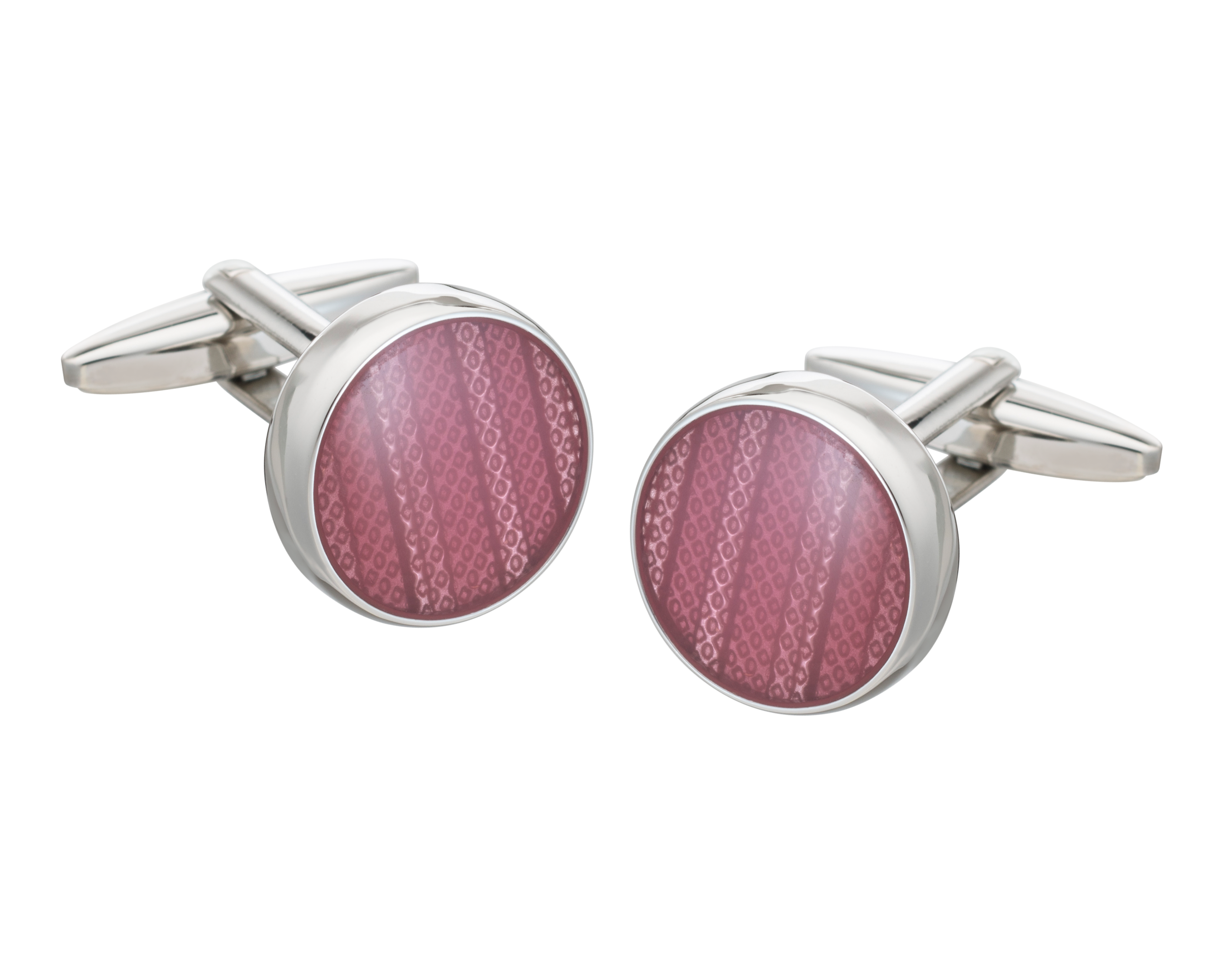 If you like to add a touch of colour to your outfit then these charming round pink cufflinks are the perfect choice. An intricate pattern is lasered onto a pink enamel inlay to create a bright and cheerful design that is perfect for weddings and other special occasions.